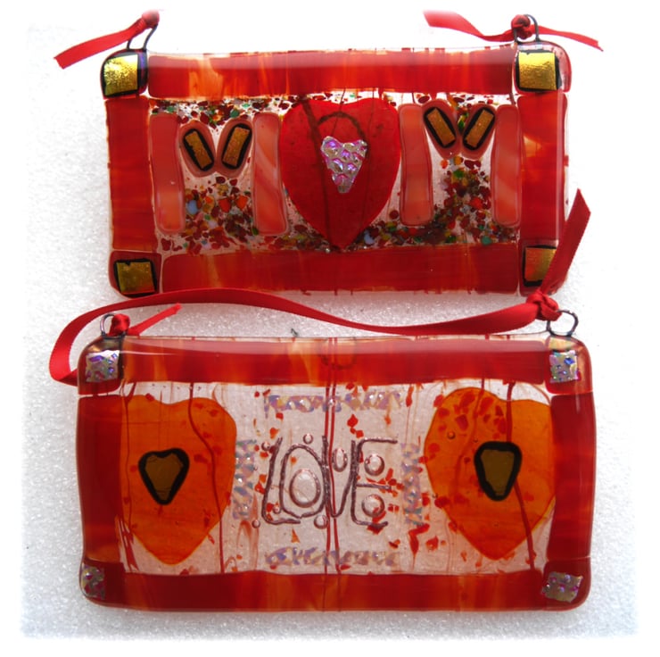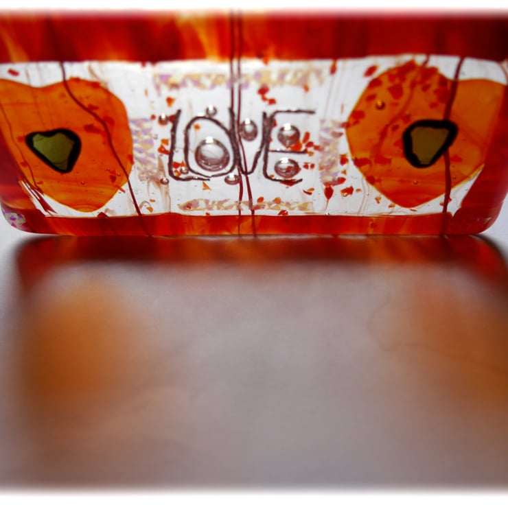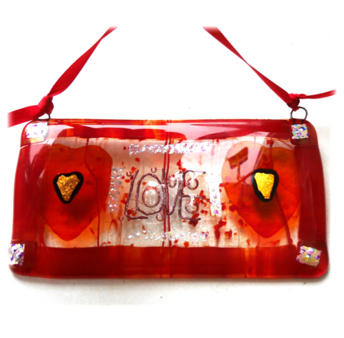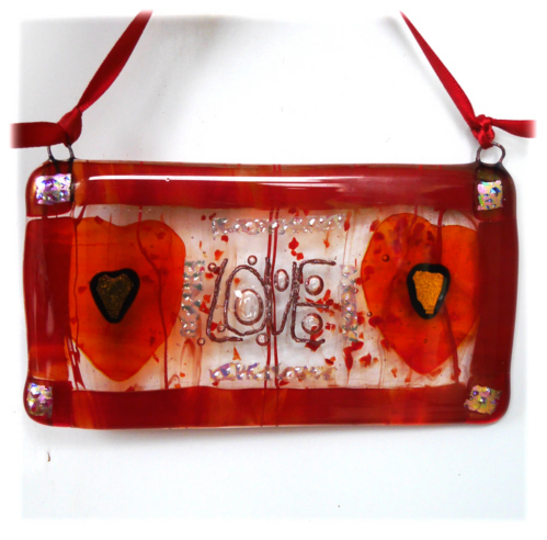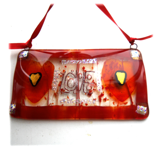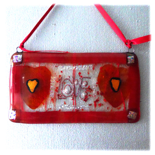 On a base of red frit collage glass and with a border of bright red glass. I've cut a red heart for either side and added the word LOVE in wire. Some really effective air bubbles have picked out the letters during the fusing process. I've added precious dichroic accents to the corners of the border, the hearts and round the lettering.