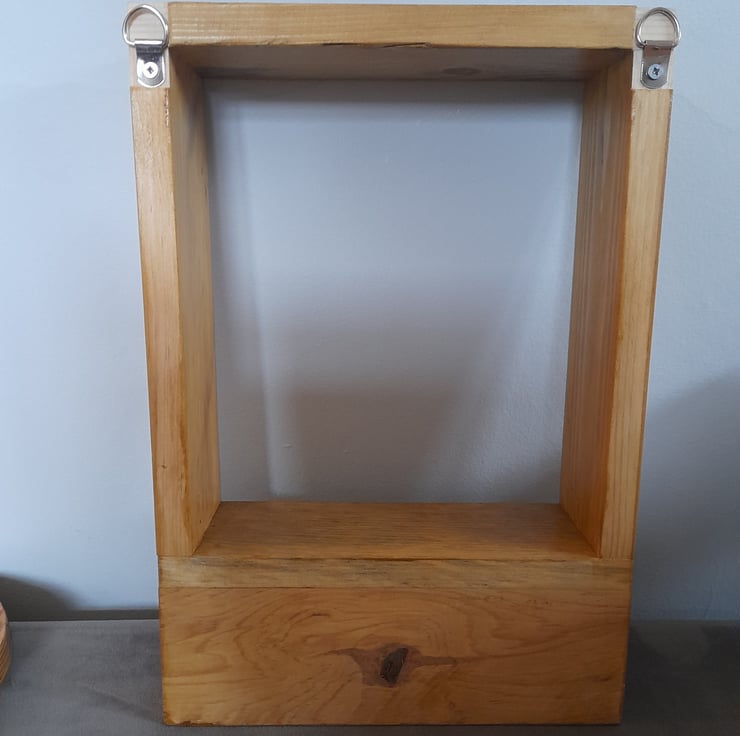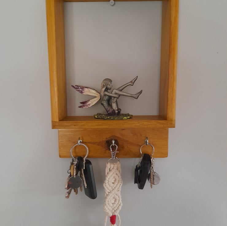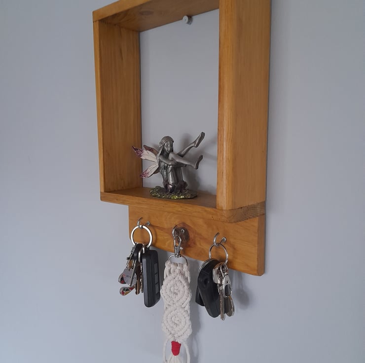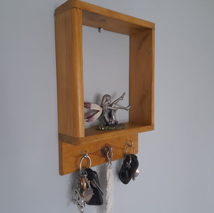 Key rack shelf unit made from recycled wood, with satin varnish finish. Comprising three hooks and supplied with wall fixings. (Screw shown is for display purpose and is not part of the unit.)