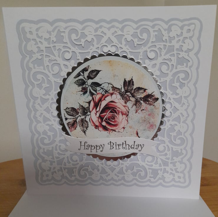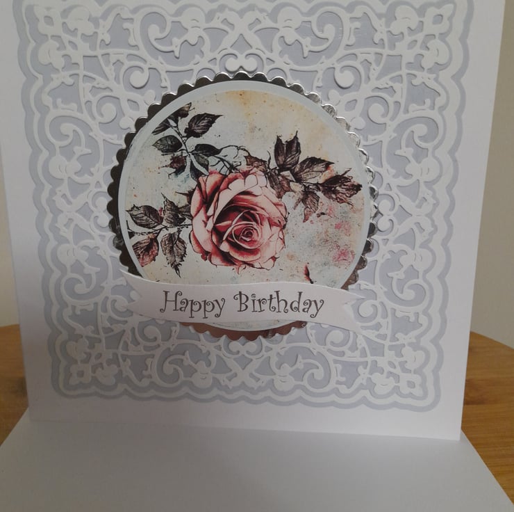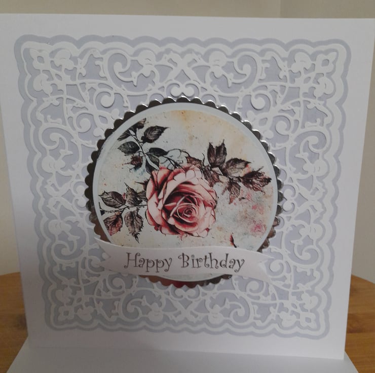 THIS LOVELY CARD HAS BEEN DESIGNED AND PUT TOGETHER BY MYSELF USING A LARGE WHITE CARD WITH ADDED FANCY DIE CUT PAPER IN SHADES OF GREY AND WHITE ALONG WITH A SILVER COLOURED FRAMED PRINT OF A PICTURE OF A PRETTY SINGLE PINK ROSE ON A BUSH, AND FINISHED WITH A SILVER PRINTED HAPPY BIRTHDAY CARD EMBELLISHMENT.