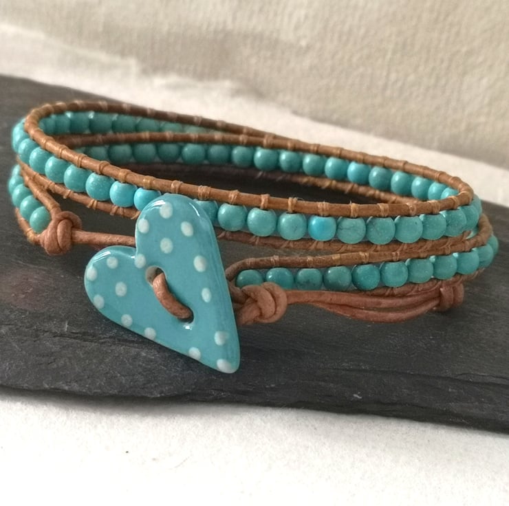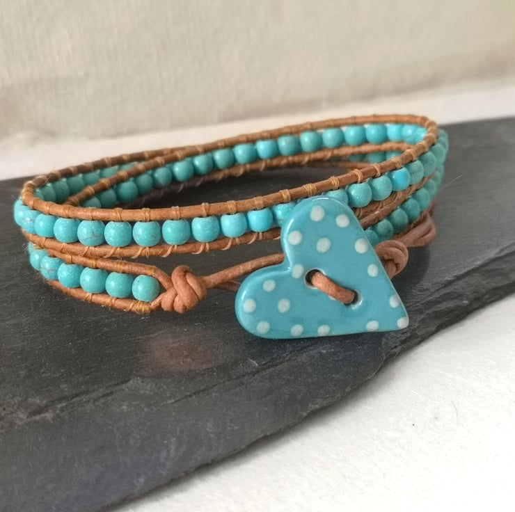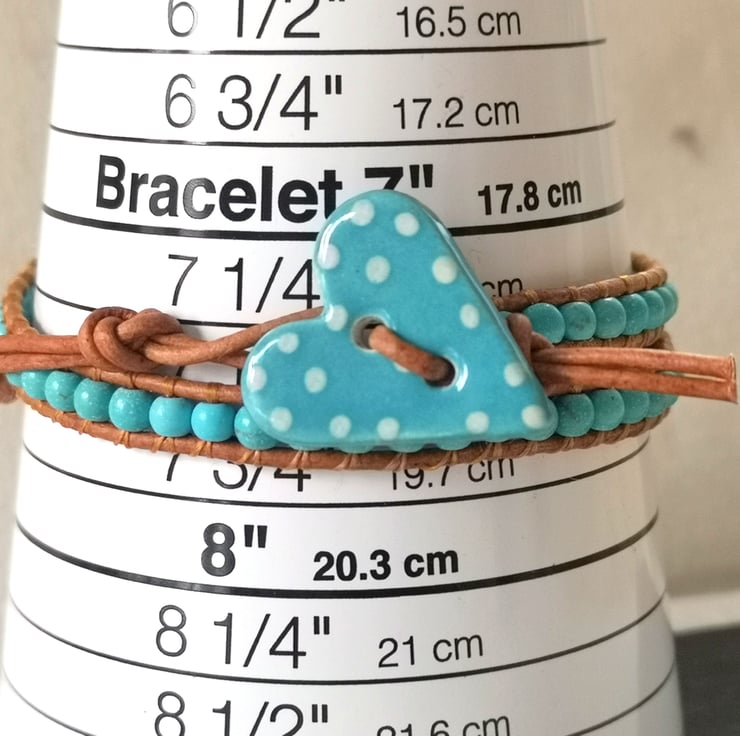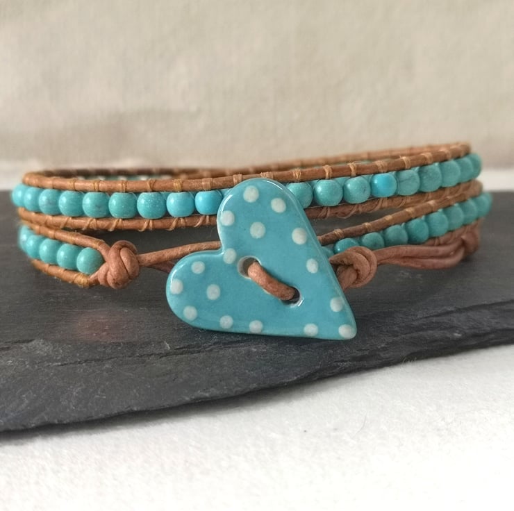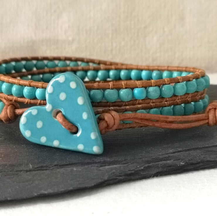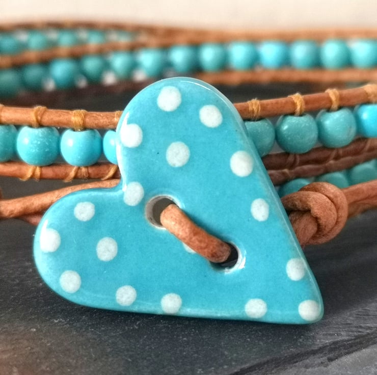This bracelet has been made with small round semi precious turquoise beads. They've been stitched onto a long length of soft tan leather cord. A ceramic heart shaped button with a polka dot pattern has been used as a fastener.