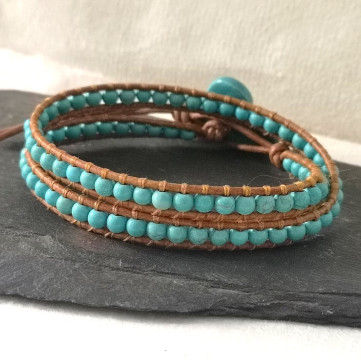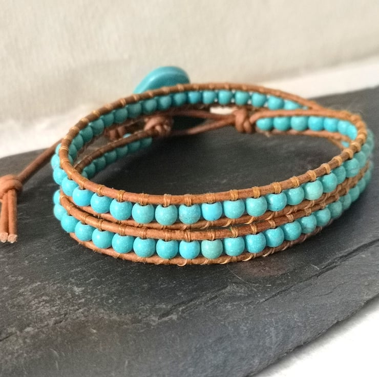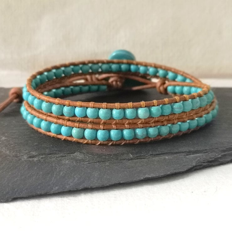 Turquoise semi precious double wrap leather bracelet with ceramic heart button