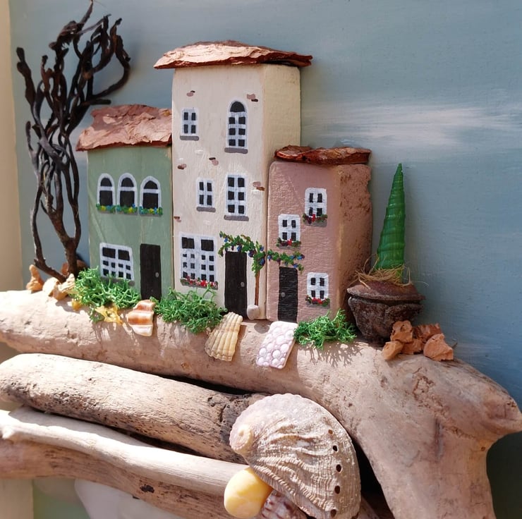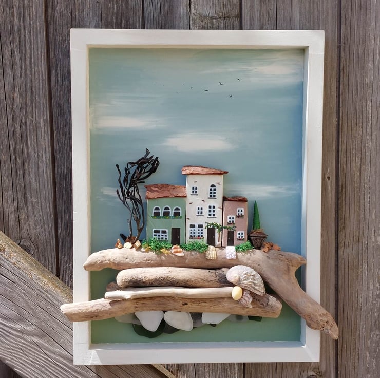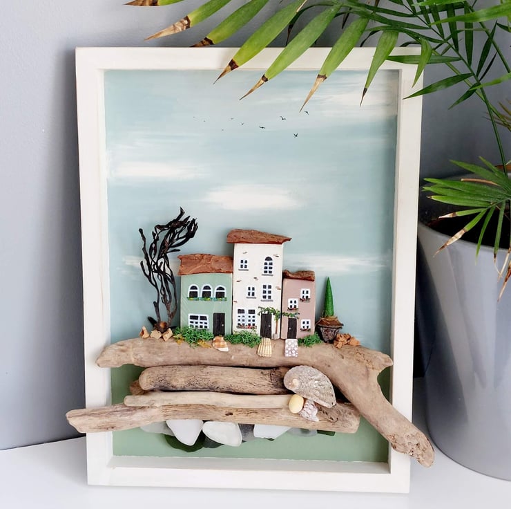 I began making miniature coastal scenes following a beachcombing trip to Morfa Beach in Conwy, north Wales. I was inspired by the colourful coastal cottages and the UK's smallest house that you can visit there. I also found an abundance of lovely chunky sea glass and pottery on the beach which I used in my early pieces, I have really enjoyed making them ever since that visit.