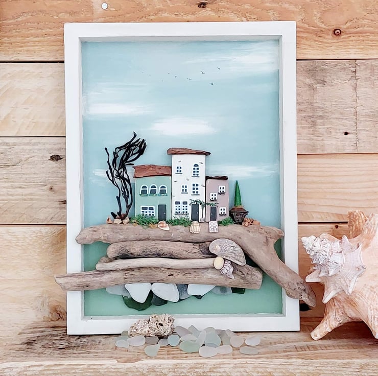 Bring the tranquil charm of the coast into your home with this unique 3D Driftwood and Sea Glass Miniature Cottages wall art. The trio of cottages, carefully hand-painted on driftwood, are set within a beautifully hand-painted wooden frame. It’s an ideal coastal-inspired gift that combines elegance with eco-friendly appeal.
