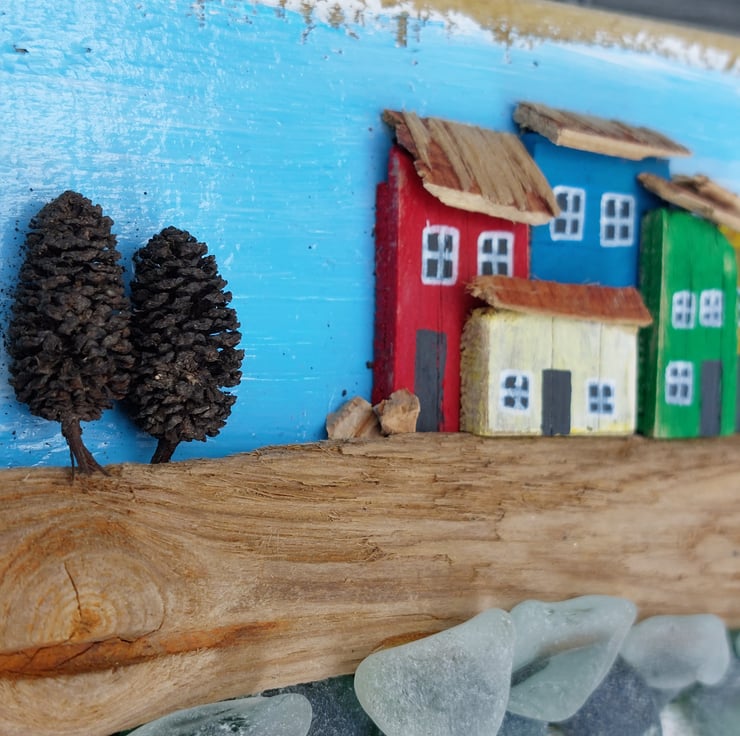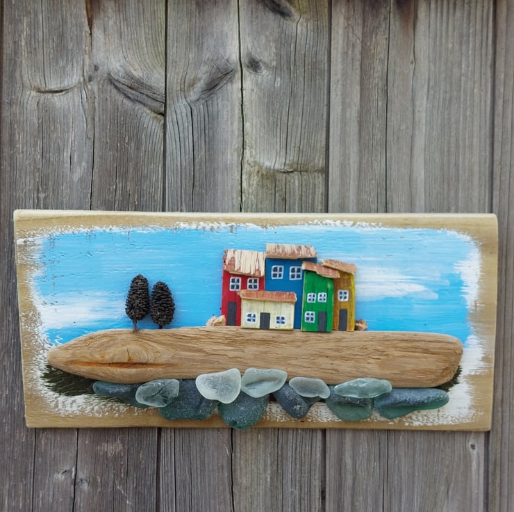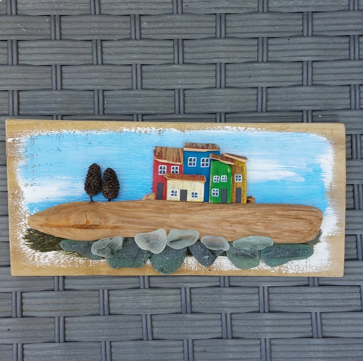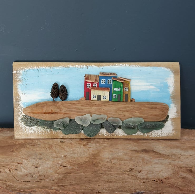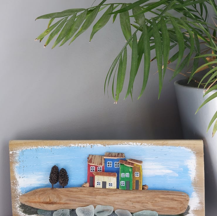 This unique and beautiful handcrafted driftwood art is perfect for coastal lovers and fans of reclaimed materials. It showcases a row of tiny coastal cottages, skillfully made from driftwood, set on a driftwood base with sea glass below to mimic the ocean. Each piece is carefully hand-carved, painted, and mounted on a reclaimed wood backing that’s been sanded, painted, and varnished. Charming details like cork, twigs, and moss add the final touches, creating intricate and delightful accents.