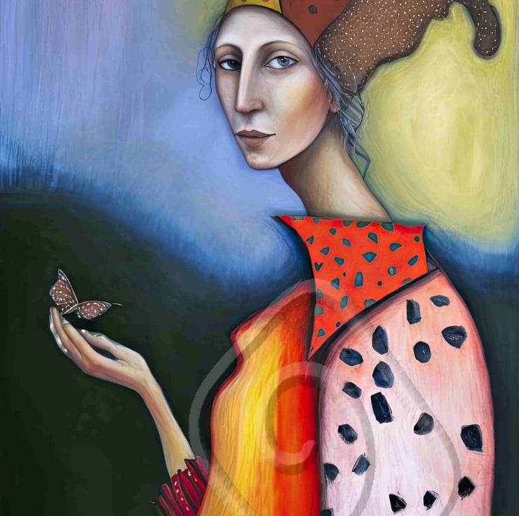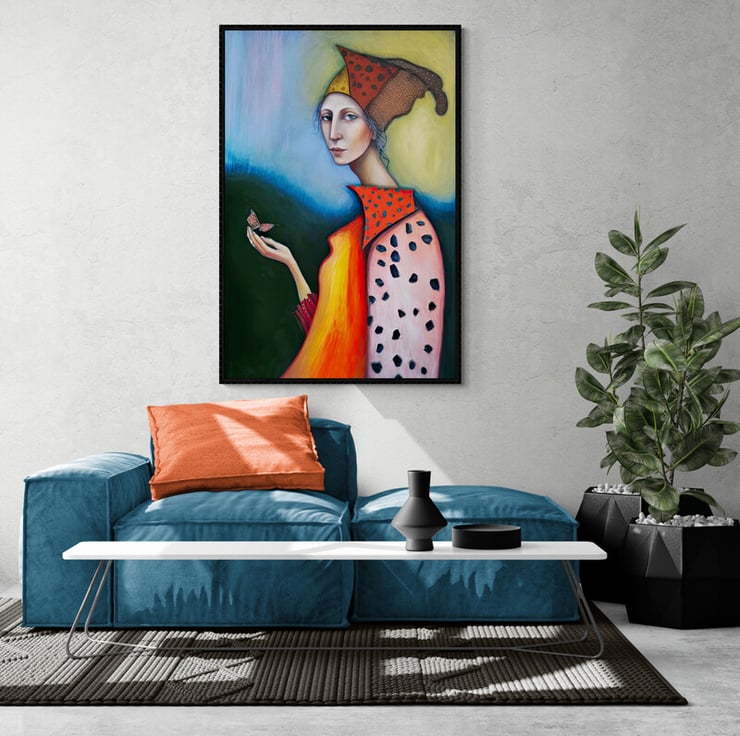 The print itself is created using high-quality giclee printing techniques that ensure the colours are vibrant and true to life. The image depicts a woman with a graceful and ethereal presence, her figure elongated and her limbs extended.