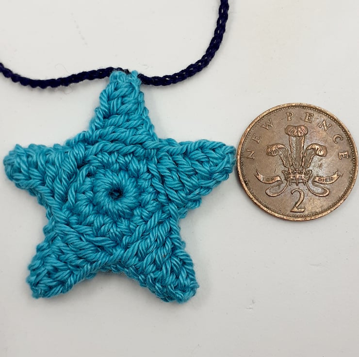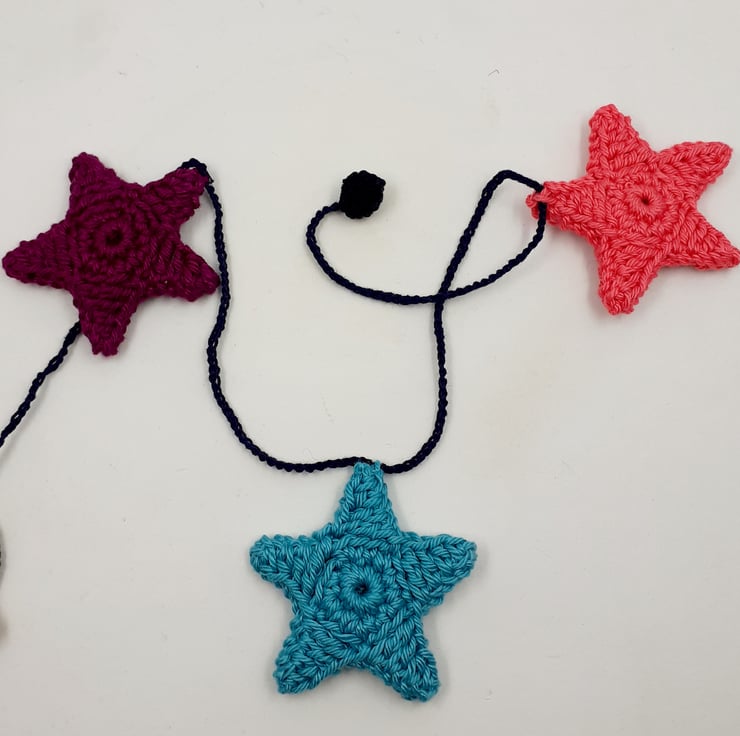 This cheerful features 10 bright crochet stars in 10 different cotton yarns. Each star is made from two motifs sewn back to back to make them keep their shape. They are joined by a midnight blue 'string ' crocheted in fine but strong cotton thread and finished at each end with a crocheted bead. The whole garland measures approximately 120cm and comes wrapped in tissue in a labelled PIP ( Postage in Proportion) box, all ready to be gifted or posted on. A tag with wording of your choice can be added to the box to make it a suitable present for many an occasion.