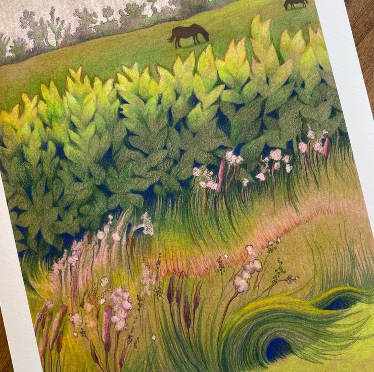 I used soft pastel and coloured pencils on toned paper to create this landscape drawing - "Dorset Fields" - which features two miniature horses grazing in a nearby field. I drew this on location in the countryside: in Higher Bockhampton, near Dorchester (in Dorset, UK). This area is known as Thomas Hardy country and his cottage (now owned by the National Trust) is nearby. The original drawing was a commission for some nearby holiday cottages.