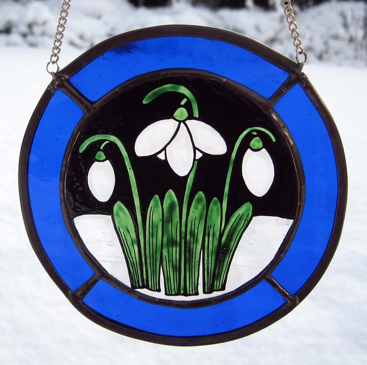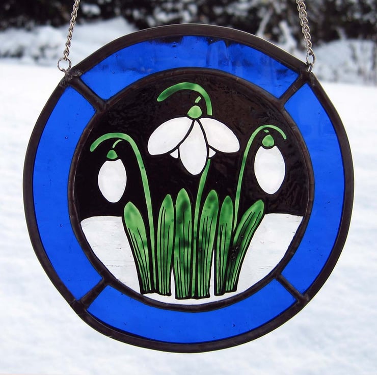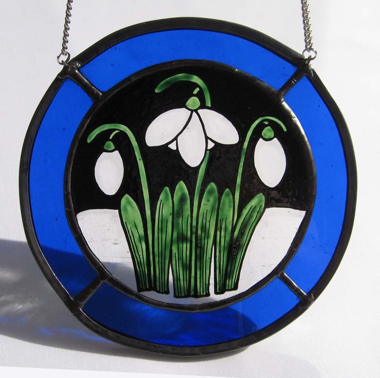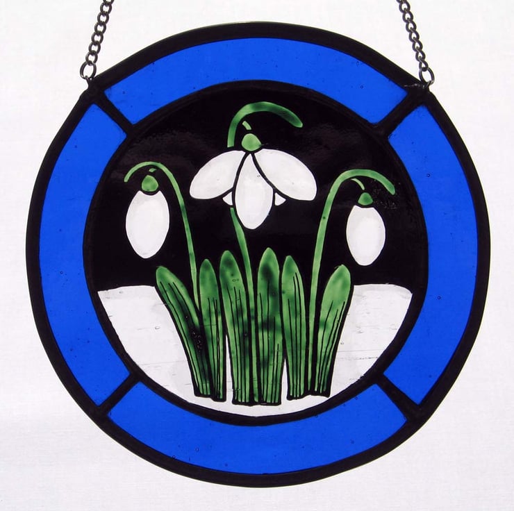 This roundel measures approx.14 cm across and has been created using traditional stained glass techniques and materials. The Snowdrop image has been painted onto antique style, clear glass and bordered with royal blue glass to enhance the snowy scene.