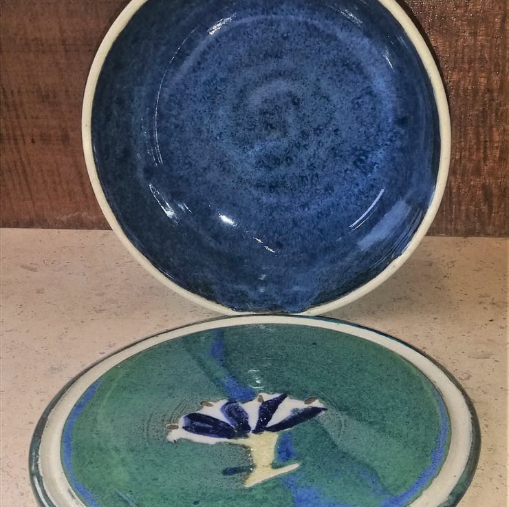 Measures: bowl/lid; 15.5 x 7 deep, plate: 16.5cm diam x 3cm high. Indent for lid.