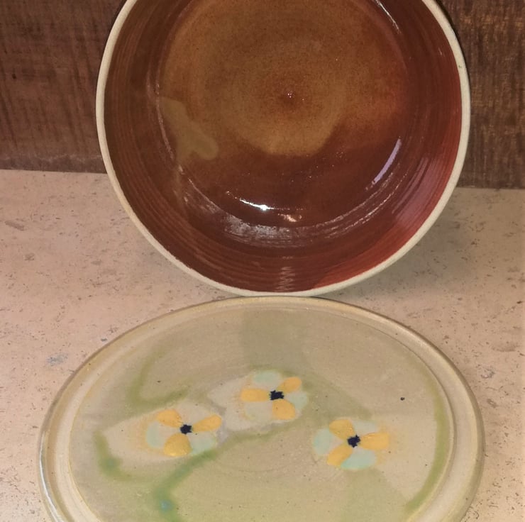 Measures: Bowl/lid 17cm diam x 7cm deep. Plate; 19cm x 3cm