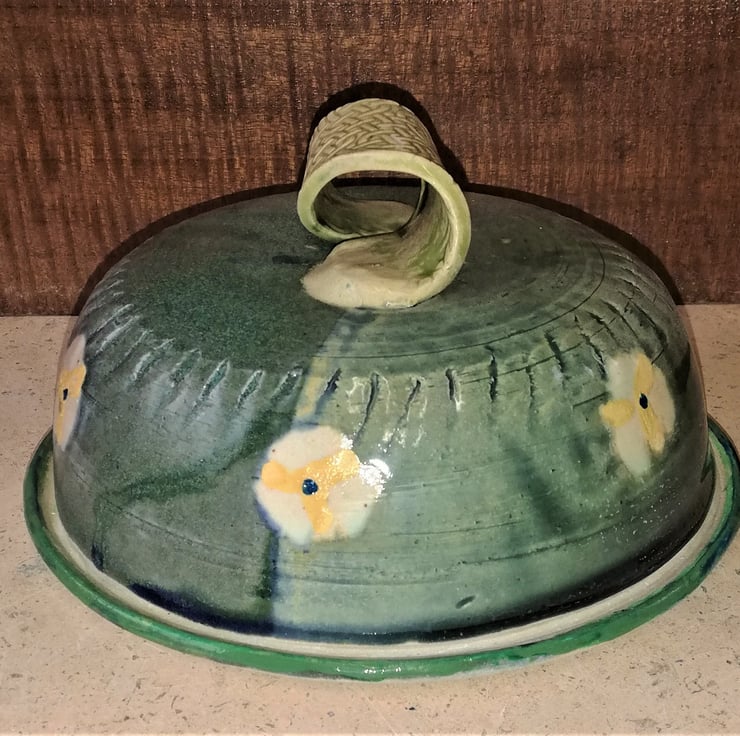 MGCD moss gree/matte turquoise with 6 yellow and white petal flower decoration around top of bowl/lid Twist, light beige, celtic decor handle.