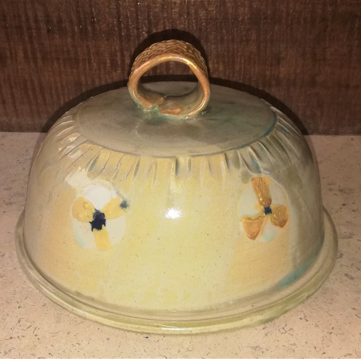 OCD Oatmeal dish with 6 pale yellow flower decorations around the top. Speckled dark beige inside.Twist gold tinted, celtic decor handle. Plate decorated with 3 flowers matching lid.