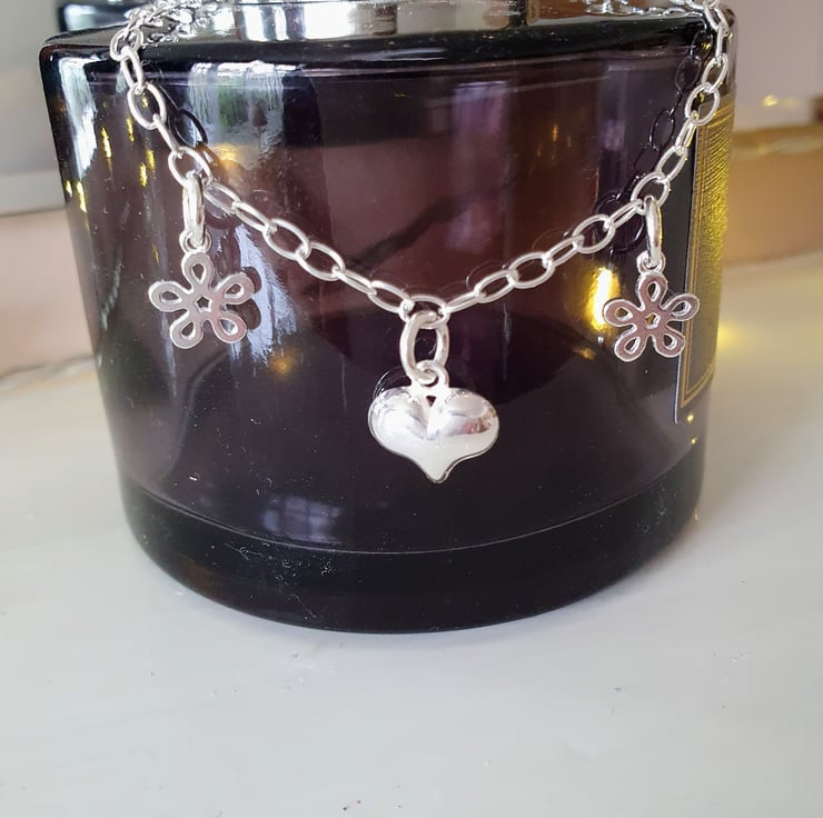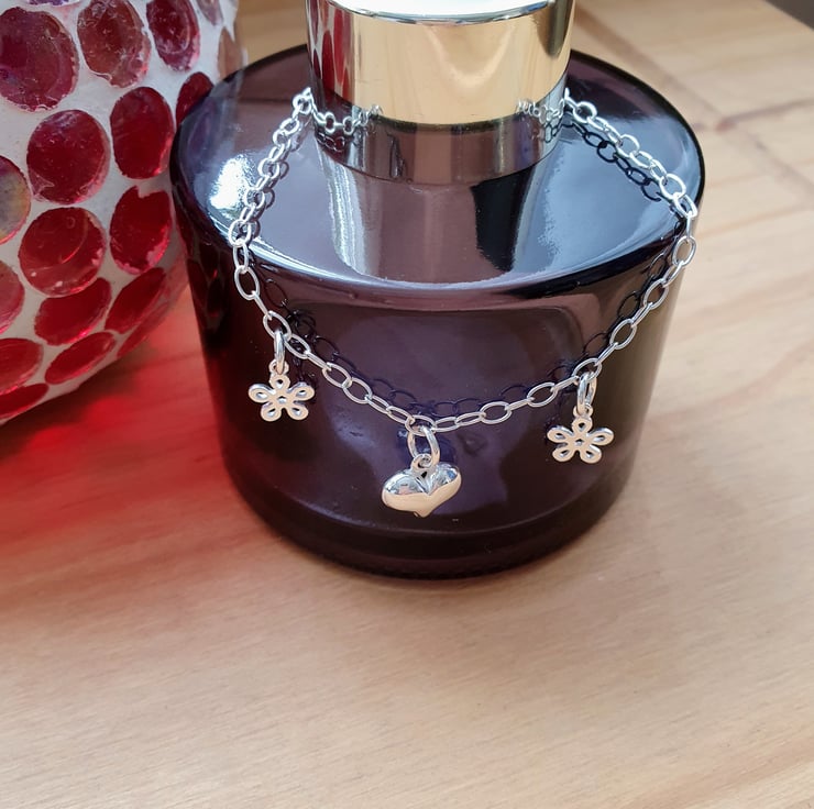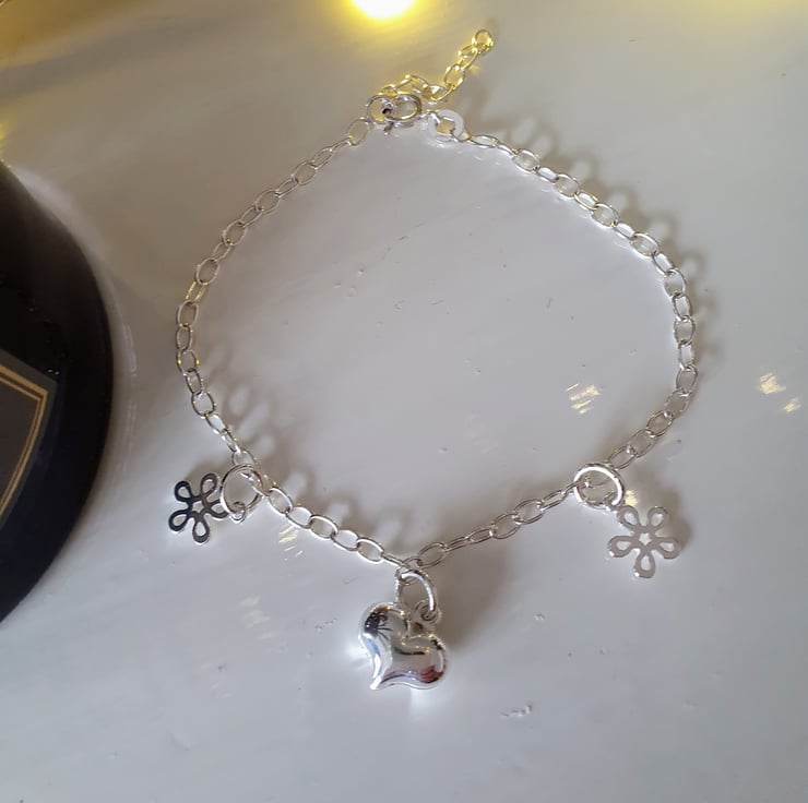 Sterling silver chain bracelet perfect for wearing everyday. Pretty puffed heart charm and flower charms are the perfect addition to this bracelet. The chain links measure 3 mm by 4 mm The puffed heart charm measures 11 mm and the flower charms measure 7 mm.