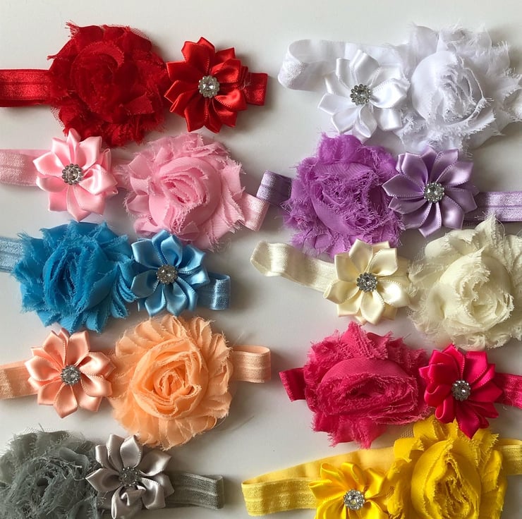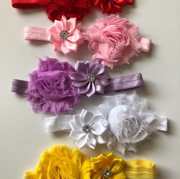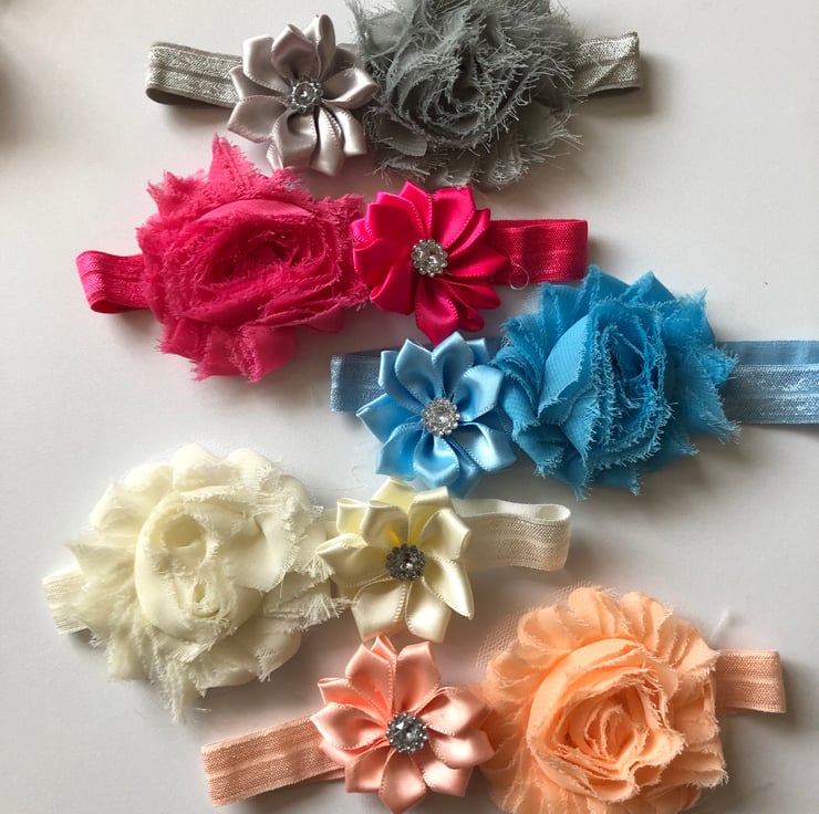 Two x Handmade flower baby bands. Two flowers with jewel in the centre of one.