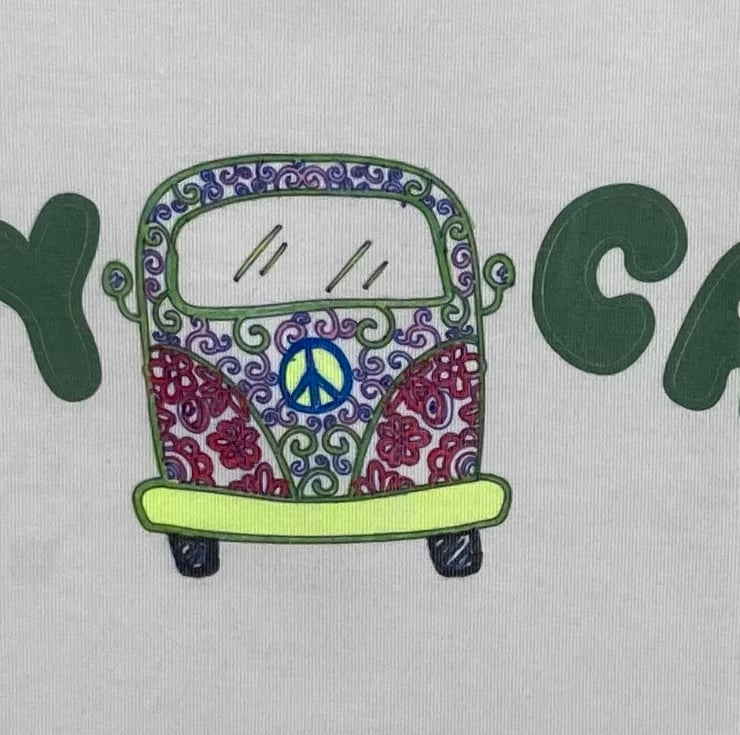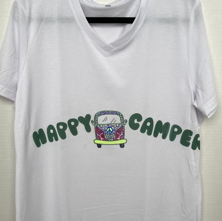 White Quality fabric T-shirt with infusible ink decals with intricate detailed VW boho style camper van decals, I only keep 1 in stock but this t shirt can be ordered in any size and any coloured lettering comes in men’s, women’s S,M ,L, XL or kids 3/4 5/7 8/10 11/13 please allow extra few day for making and posting thank you for your patience.