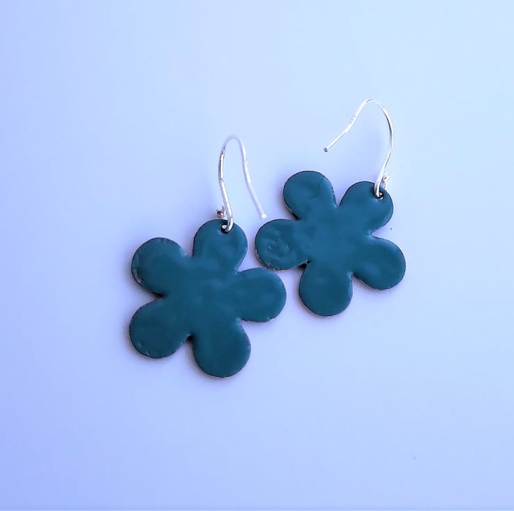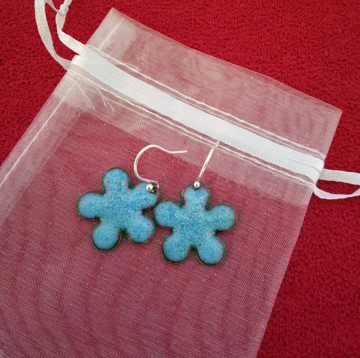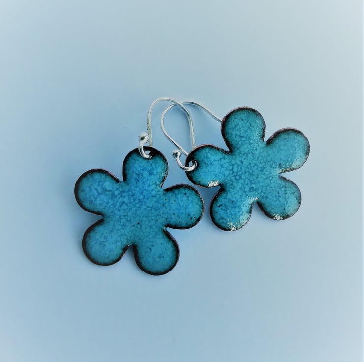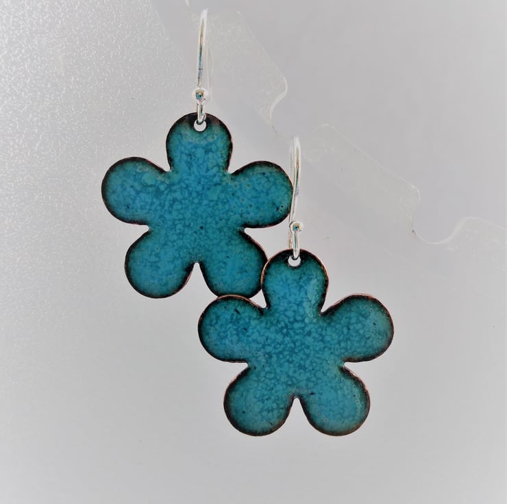 Five petal flower shaped copper earrings enamelled in shades of turquoise with mottled effect. The earrings have been kiln-fired and the shape (not including the ear wires) just fits into a square measuring 24mm x 24mm. The back has been finished in glossy turquoise enamel and the edges left in natural copper, buffed to a soft shine. They come complete with sterling silver ear wires and are supplied with a little organza pouch.