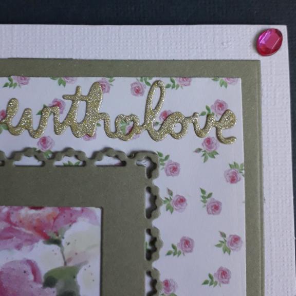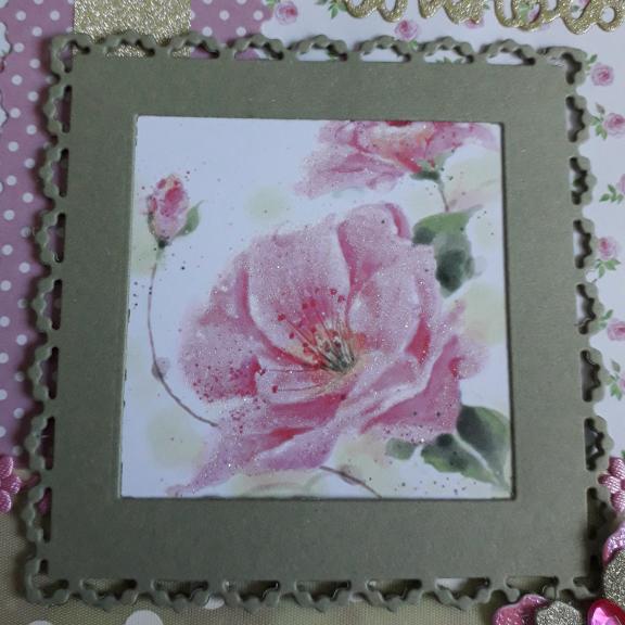 A 15cm square card for Mothers day, it features a lovely pink glittery rose in a sage green fancy die cut frame, I have placed this on a background pattern of small pink roses, then another square of the sage green card, the base card is white linen effect,