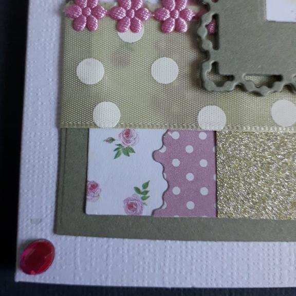 There is a strip of pink spot patterned paper under left side of the topper with a green glittery ribbon on top, and a green spot patterned ribbon with pink flower chain on top towards the bottom of the card. I have also added a die cut glittery bow with a pink gem to the bottom right hand corner of the frame, there is a pink gem in each corner of the card.