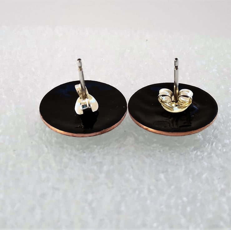 A pair of domed copper stud earrings in shades of green. The earrings have been kiln-fired and each measures 15mm in diameter, with sterling silver posts and scrolls (aka butterflies). The backs have been finished in glossy black enamel and they are supplied with a little organza pouch.