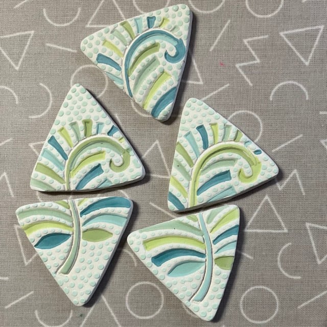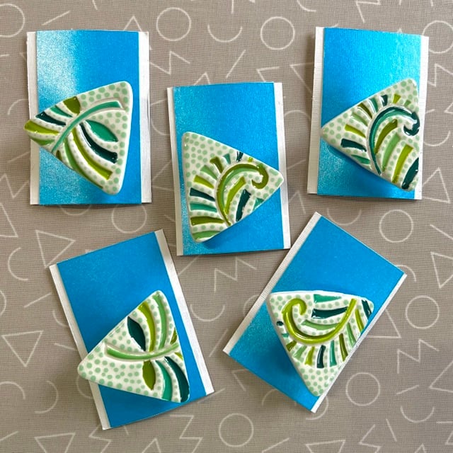 Made from white earthenware clay, these textured brooches are handmade from start to finish. Initially texture is applied to the surface of the clay using a decorative wooden block with a leafy fern design. The brooches are cut from the textured clay slab with a triangular shaped cutter. Each piece is then air dried for several days before being kiln fired to form bisqueware.