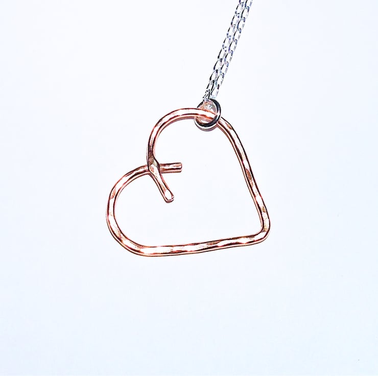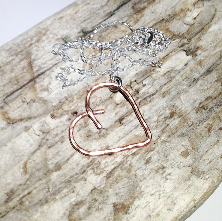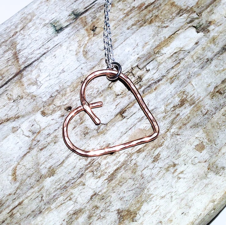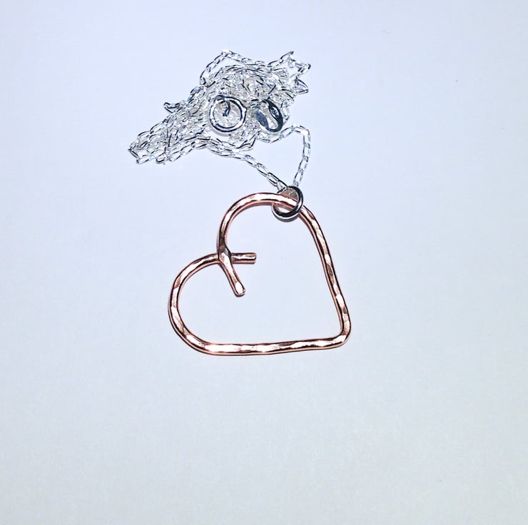 I have made this beautiful pendant from copper wire which I have fashioned into a heart shape and then soldered before giving it a hammered and polished finish.