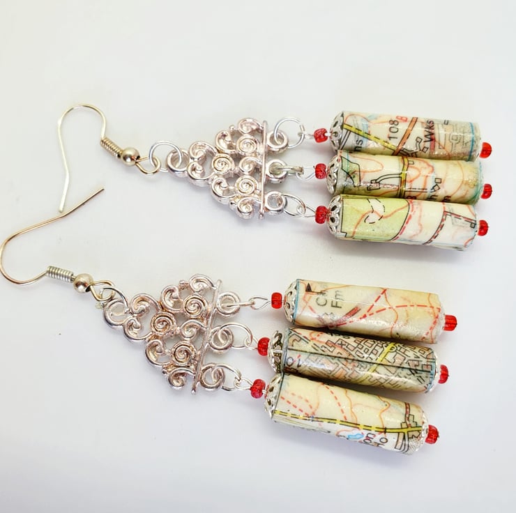 Ornate and colourful paper beaded chandelier earrings. Made with an old OS map of Oxford, UK.