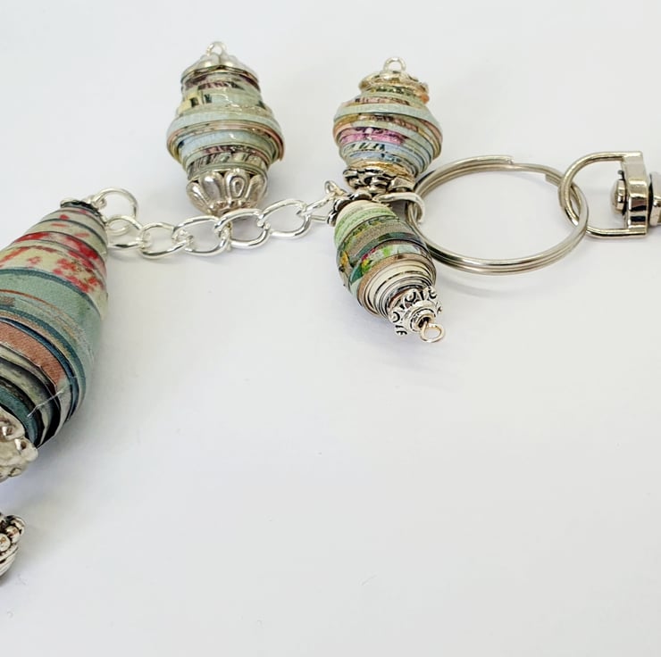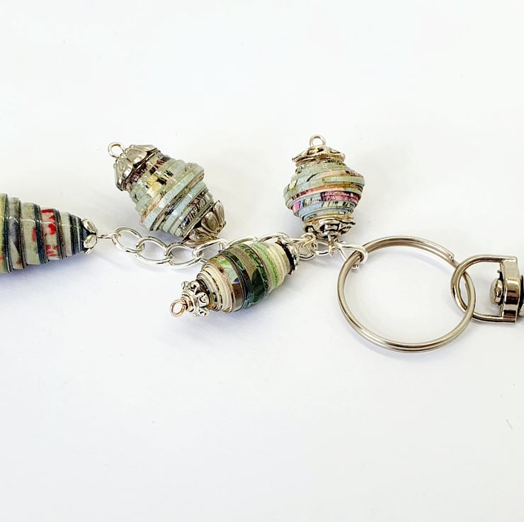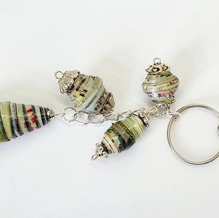 A keyring with a difference! Made with hand rolled paper beads of different sizes and shapes.