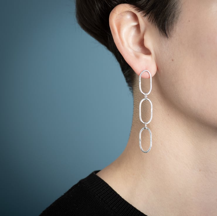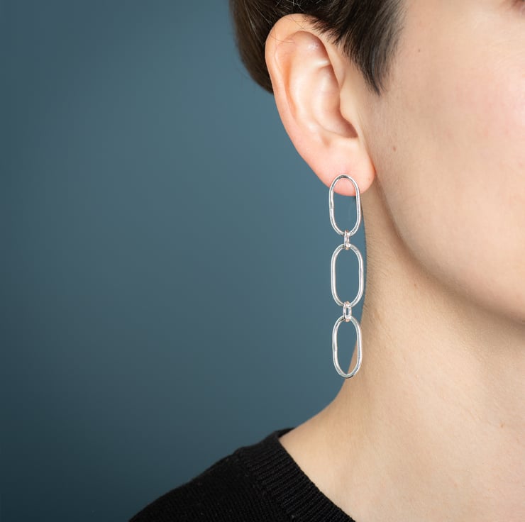 To make these statement stud earrings, I start with silver wire, which I solder into a circle, and then form into oblong shapes. I then link them together with soldered smaller circles, and hammer the front with an old hammer to give them an interesting surface texture.