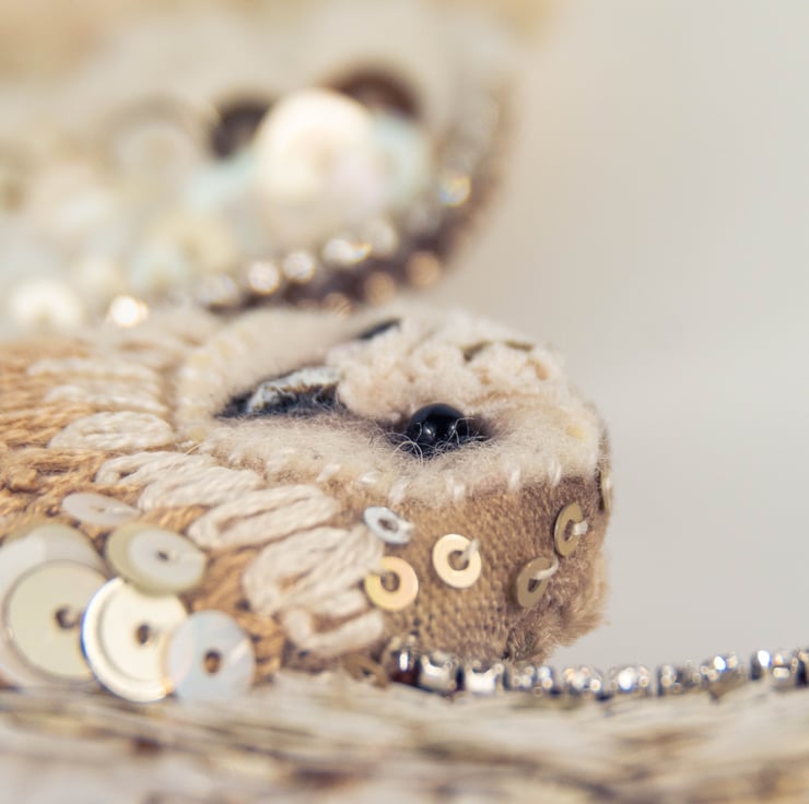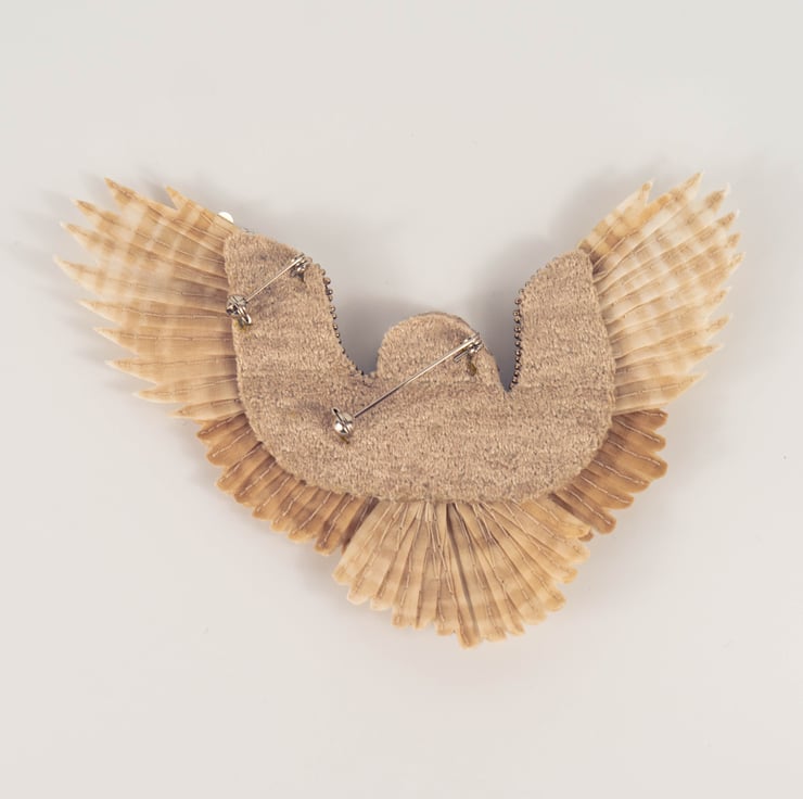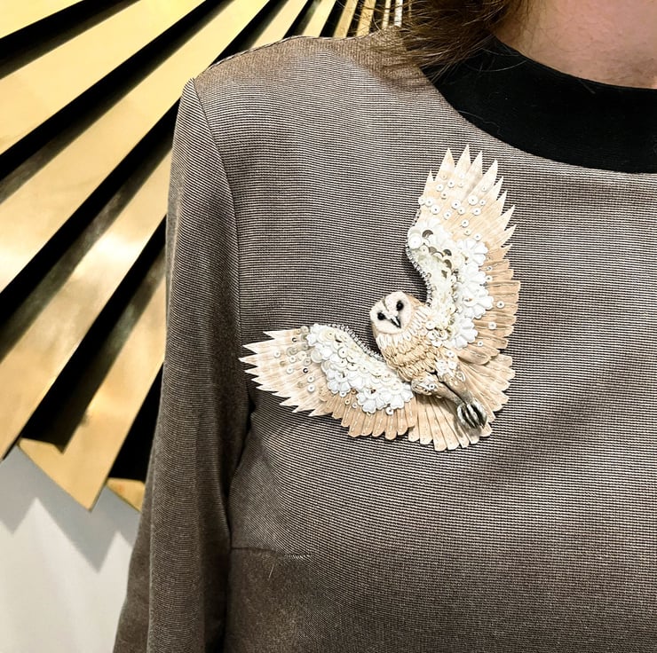 This Large Barn Owl Brooch from the “Bird Park” collection presents a distinctive colourful design. Adorned with complex detailing, the embellishment has an upbeat (even holiday) feel. It only seems fragile. The beak and wings are rigid and safe for clothes.