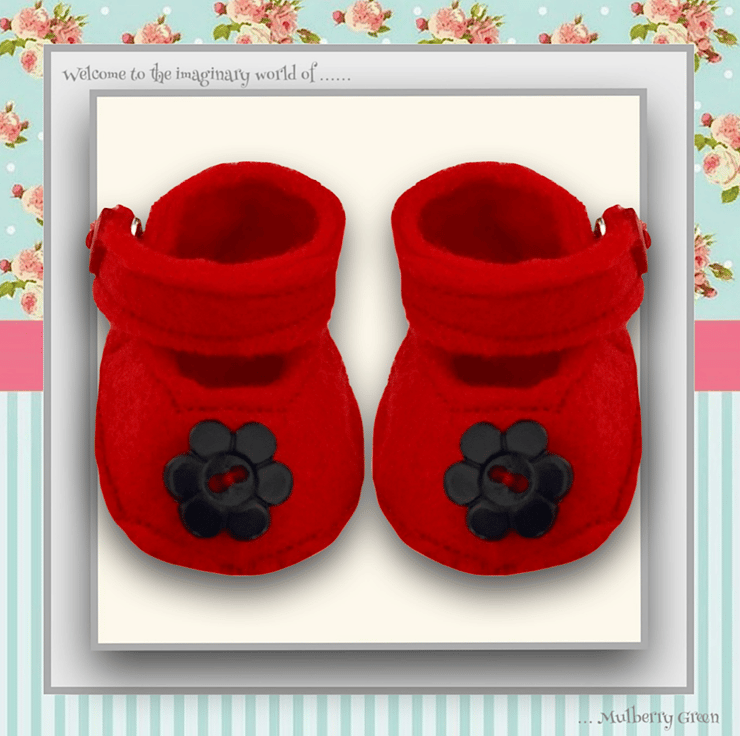 A lovely little pair of red shoes, decorated with nay blue flowers, to fit the Mulberry Green characters. They fasten with a little popper underneath a button.