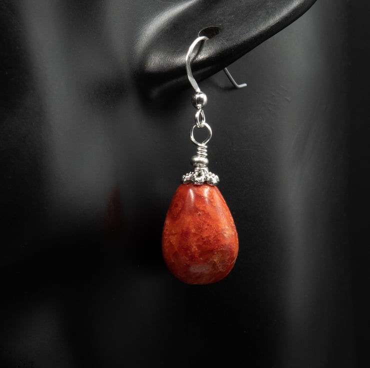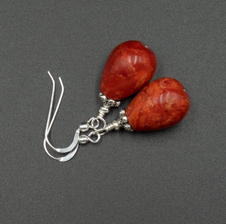 Sponge coral gemstone earrings, coral silver teardrop earrings.
