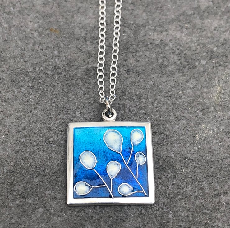 This enamel pendant was inspired by a wildflower known as ‘Honesty’ which originated from South-East Europe. I wanted to capture the delicacy of these beautiful, almost, ethereal wildflowers. The pendant measures approx: 1.5cm square and it’s made from Sterling and Fine Silver with Enamel. Hangs on an 18” Sterling Silver chain.