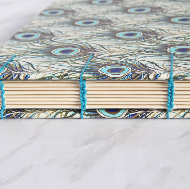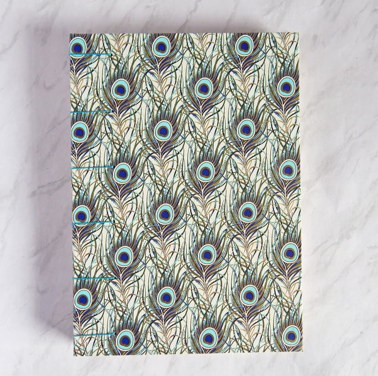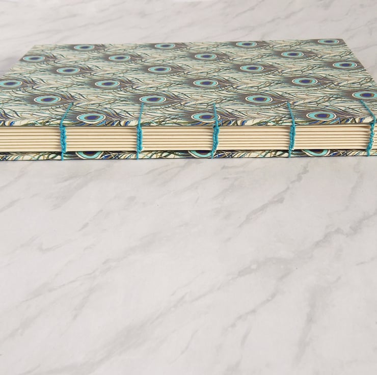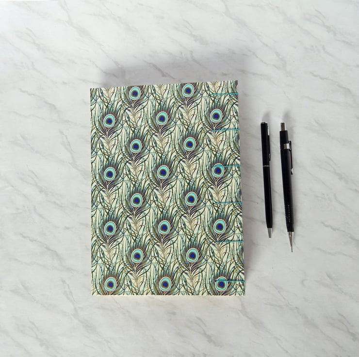 Hand made journal or sketchbook with peacock feather hard covers and plain cartridge paper pages. Would also make a nice guest book for a wedding or other party.