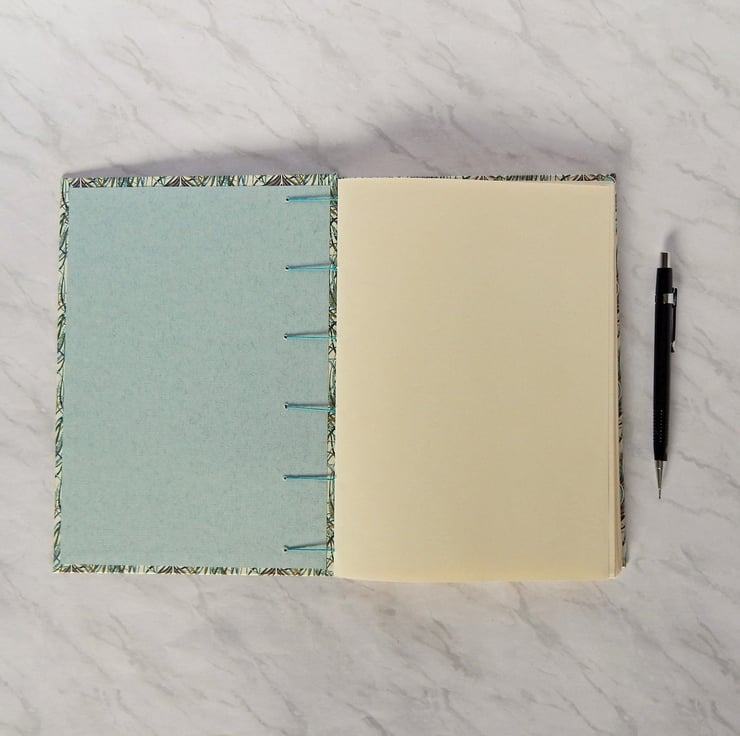 Hand bound in turquoise linen thread, using a Coptic style chain stitch binding.