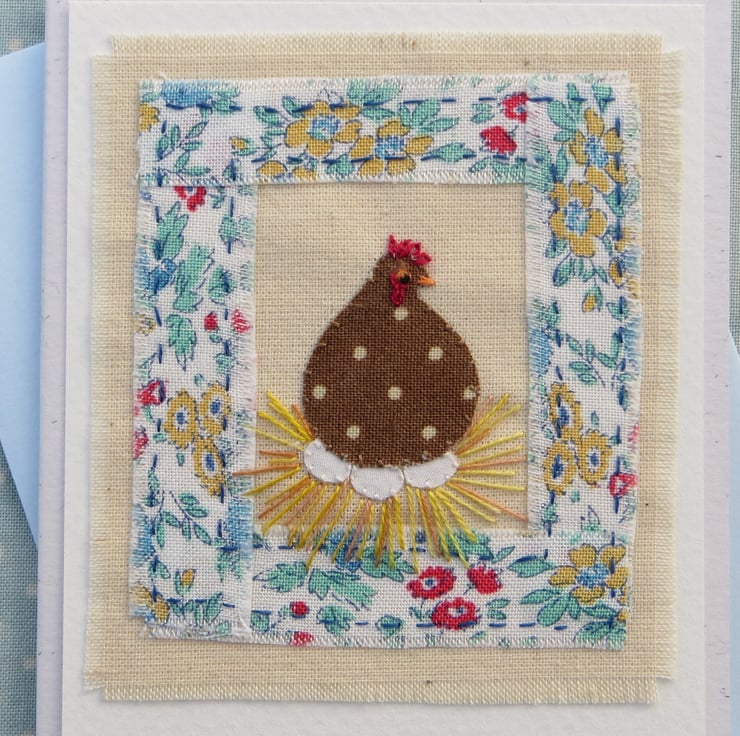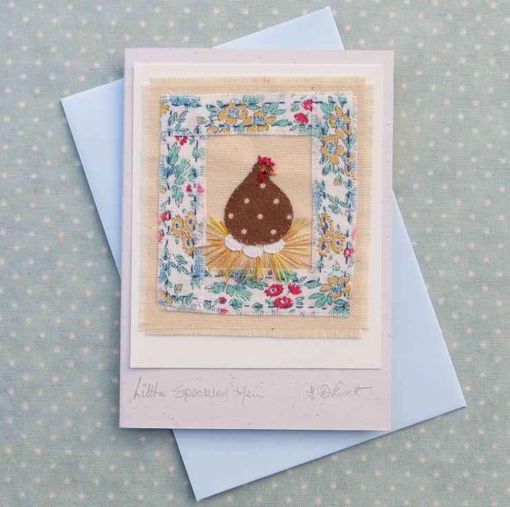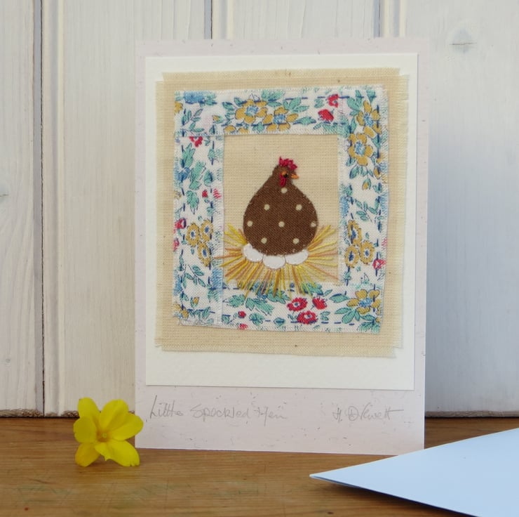 This is a small hand-made greeting card featuring a miniature hand-stitched applique made with pretty cotton fabrics with intricate embroidered details. It is entitled 'Little Speckled Hen' and is a gift in itself as well as a card in which to write your message - definitely a card to keep! (perfect for the new poultry keeper!)