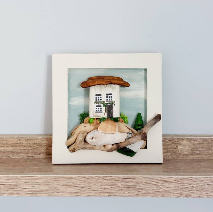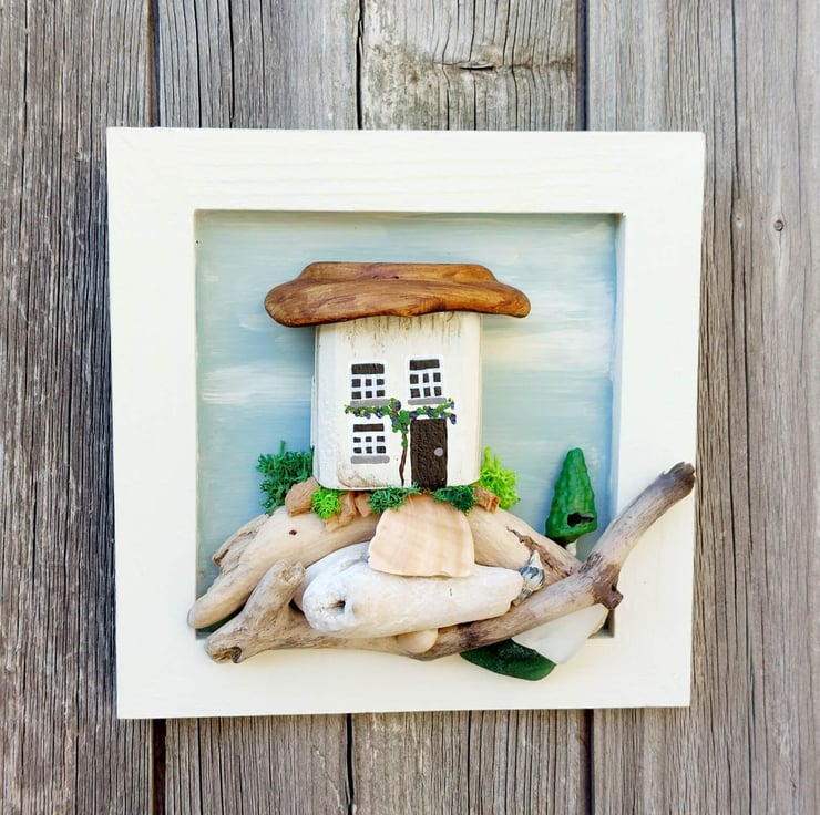 This adorable piece of coastal artwork shows a hand painted coastal cottage perched on pieces of driftwood. It has been crafted by hand painting a piece of salvaged wood, topped with a piece of beach pottery for the roof. The cottage is perched on natural driftwood and finished with sea glass and shells. This hand painted piece has been created within an open box frame and has a saw tooth hook on the reverse so it is ready to easily hang on your wall.