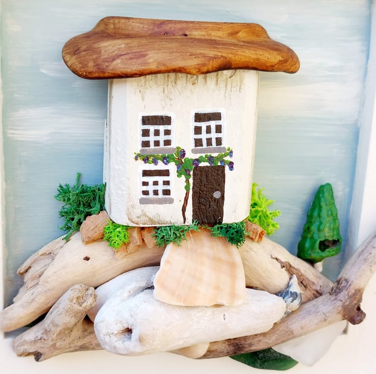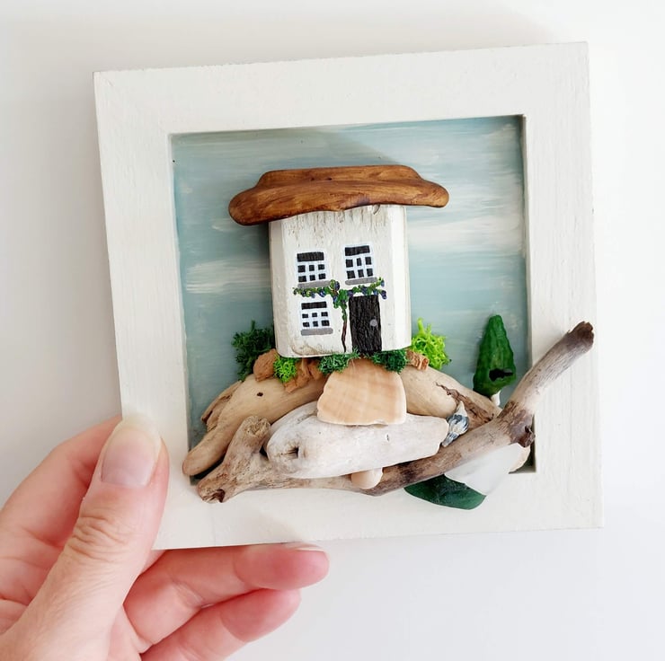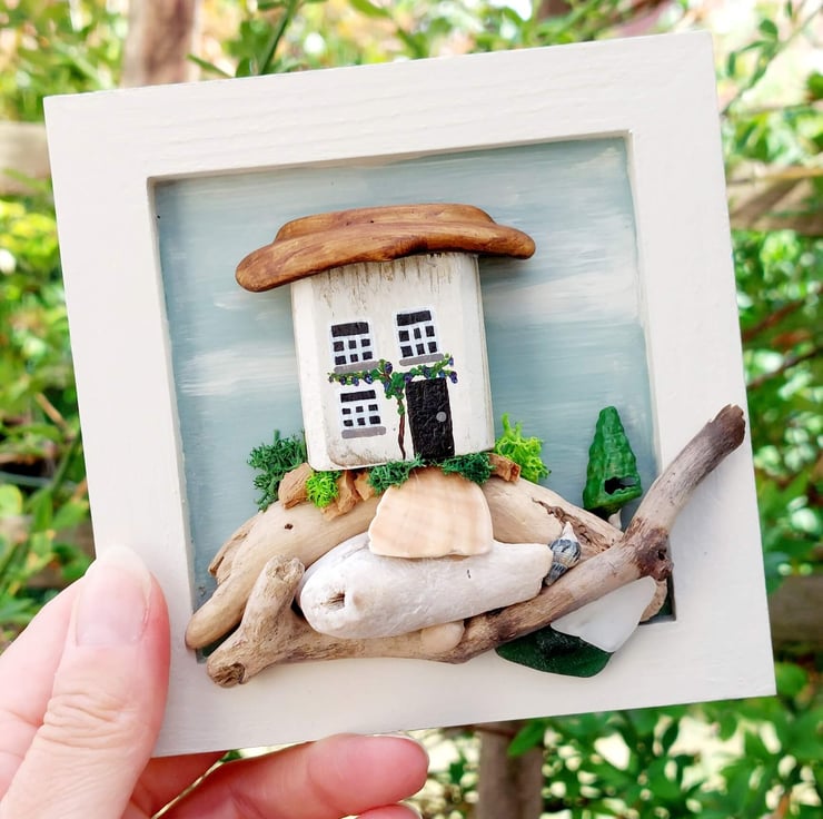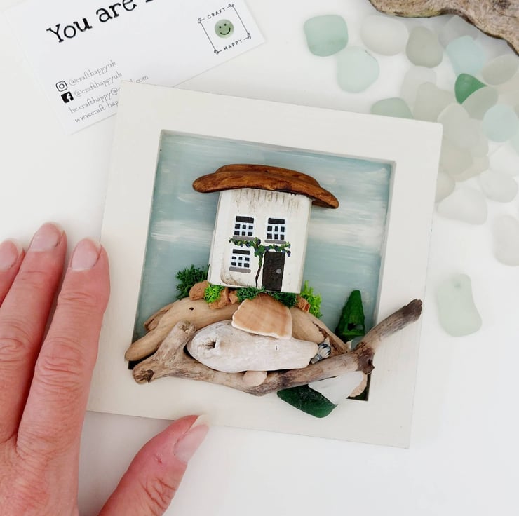 I began making miniature coastal scenes following a beachcombing trip to Morfa Beach in Conwy, north Wales. I was inspired by the colourful coastal cottages and the UK's smallest house that you can visit there. I also found an abundance of lovely chunky sea glass and pottery on the beach which I used in my early pieces, I have really enjoyed making them ever since that visit.