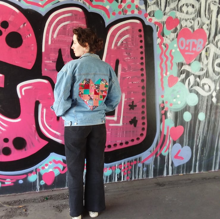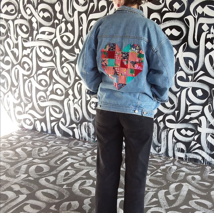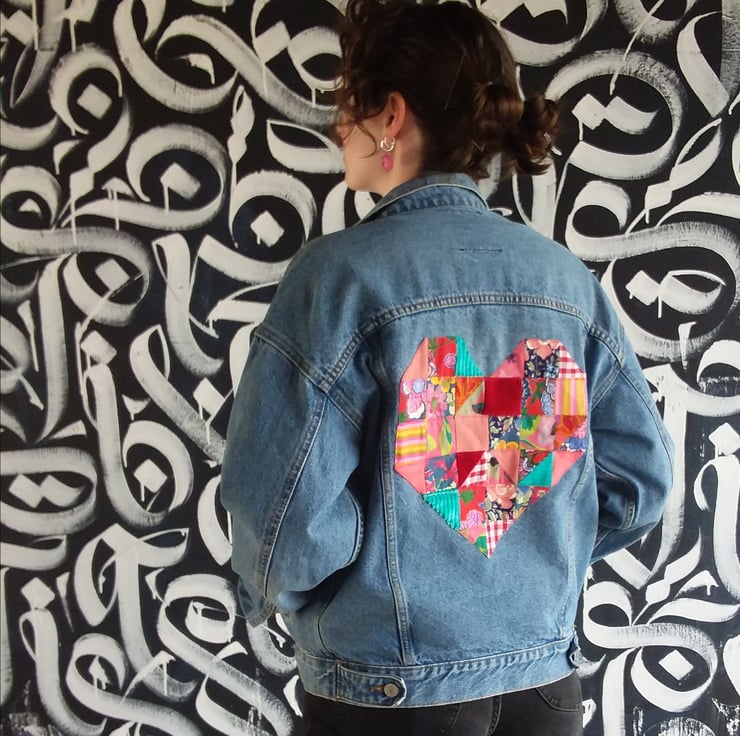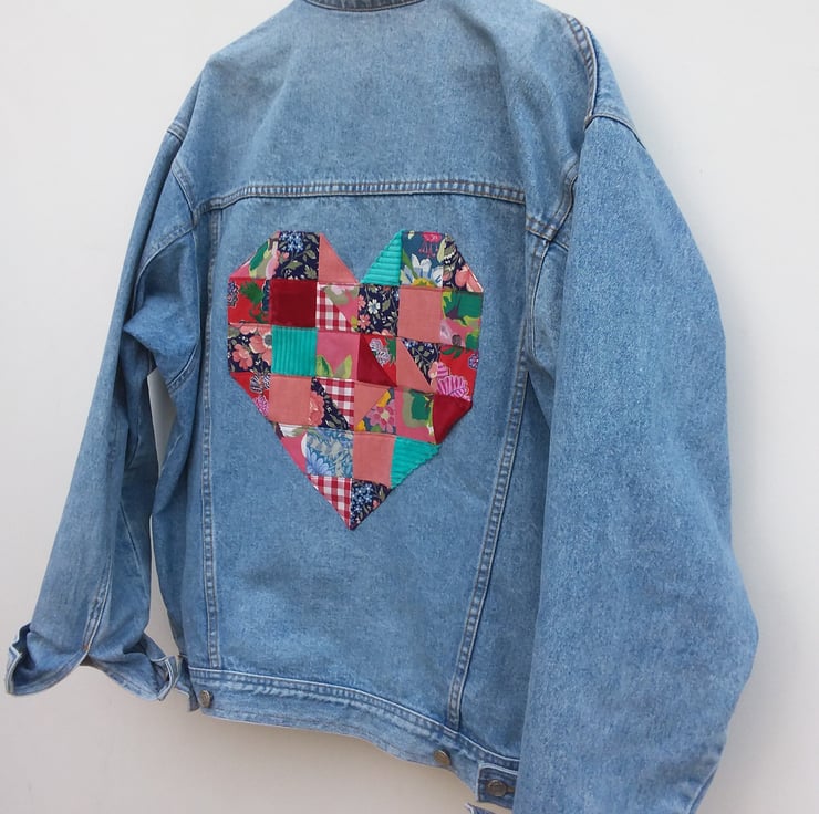 Traditional denim jacket decorated on the reverse with a large patchwork heart in vintage pink and red fabrics.