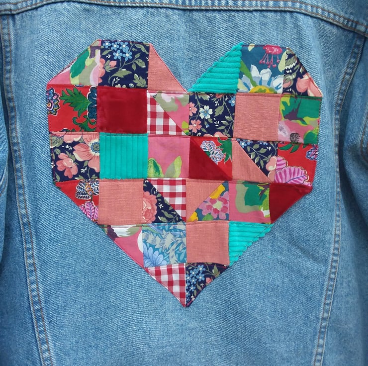 5cm squares and triangles in a mixture of fabrics - velvet, linen and floral. The heart measures 18cm x 18cm and is placed within the central back panel of the jacket. Nothing has been added to the face of the jacket.