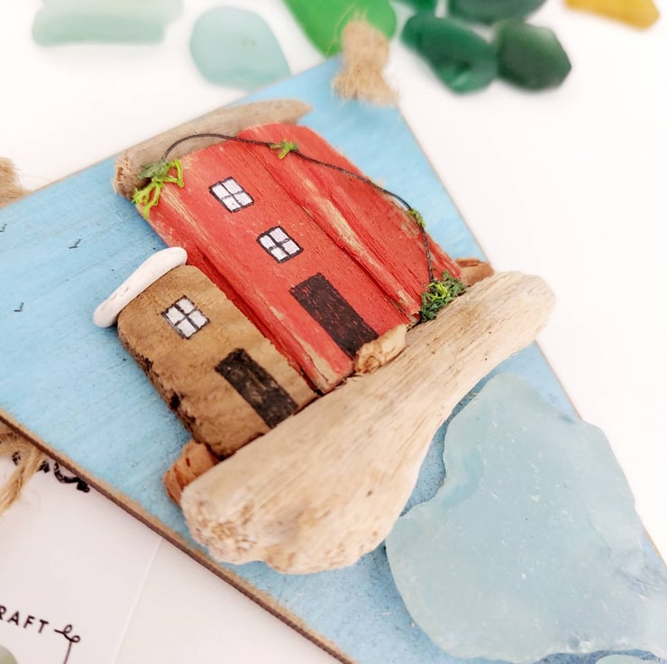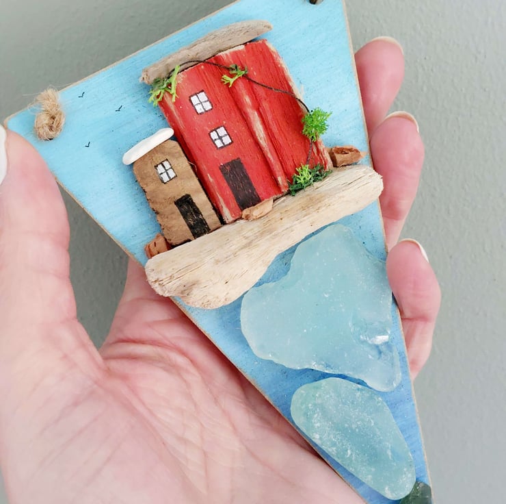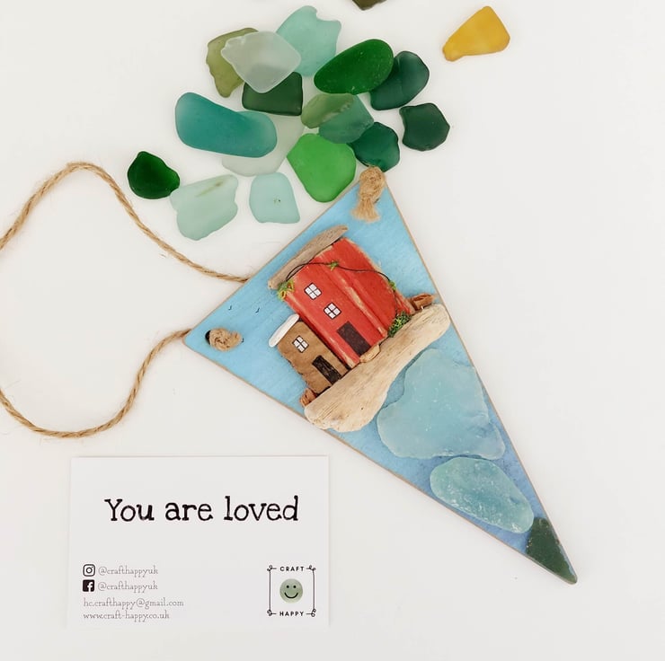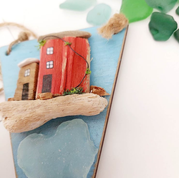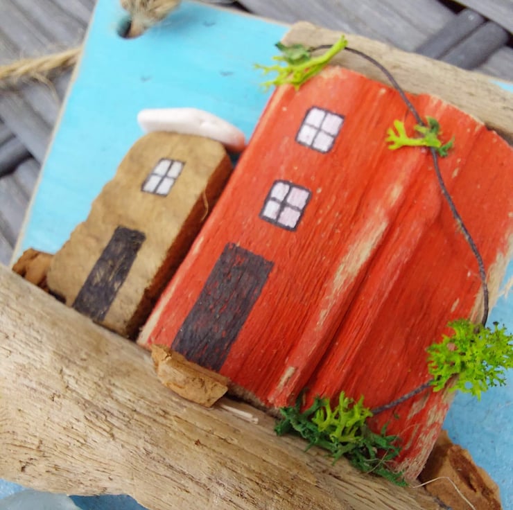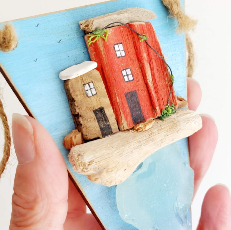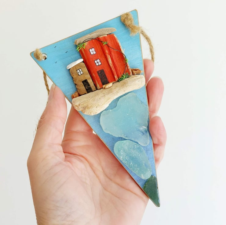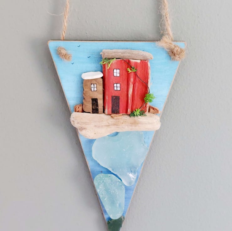 This bright and cheery bunting shaped hanging decoration featuring hand painted miniature driftwood cottages has been lovingly created using materials I have collected on my beachy travels. I created it purely because it brings a huge smile to my face and makes me want to go and live there! This piece, with its coastal vibe, will make a wonderful gift for someone who loves the seaside and will complement any coastal themed decor.