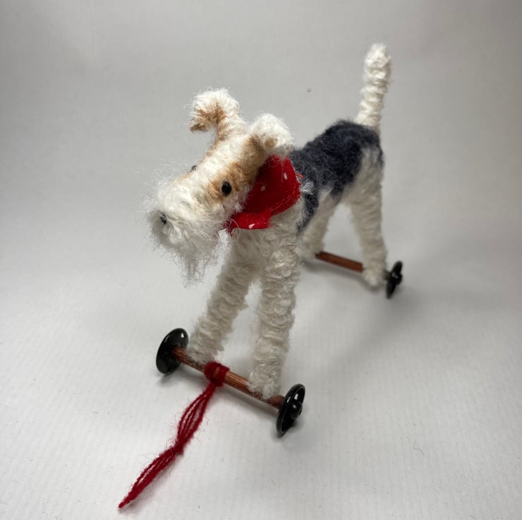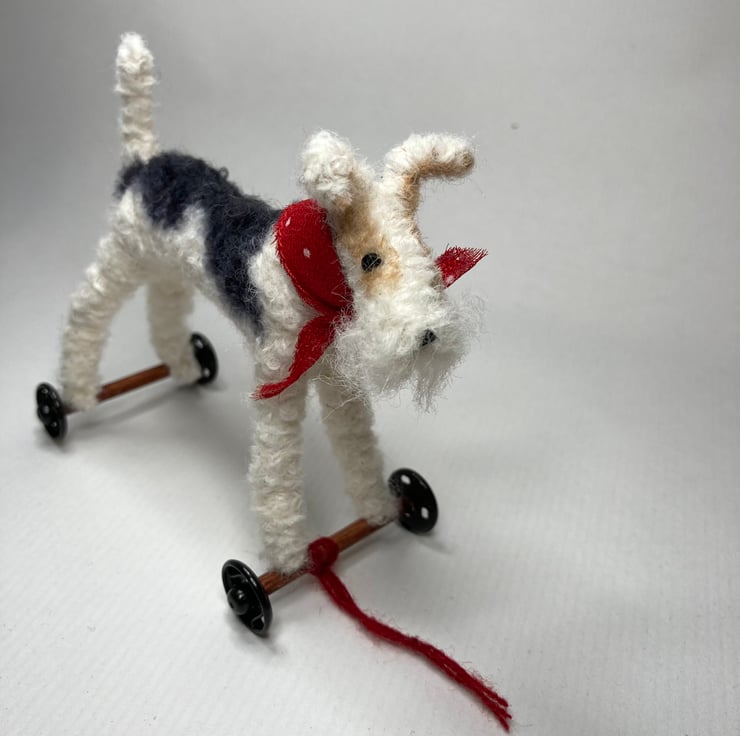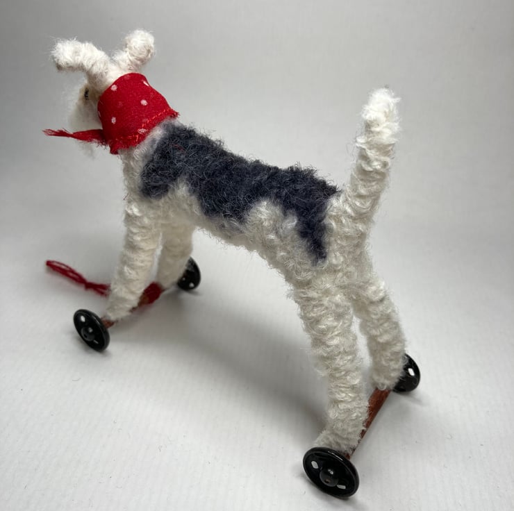 OOAK sculptured miniature dog on wheels. Bob stands 9.5cm tall and is 12cm across. He has a red spot bandana. All my animals are hand finished with eyes and noses and, if needed, wool whiskers! The wheels are for decorative purposes only and do not turn.
