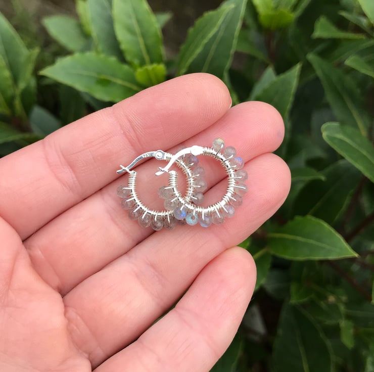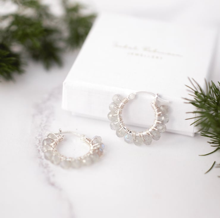 Crafted in sterling silver, these gemstone hoop earrings have been designed and made by Isobel Robinson in Yorkshire, UK. Faceted beads of labradorite are wrapped with sterling silver thread around a central hoop to create these subtle yet sparkly earrings.