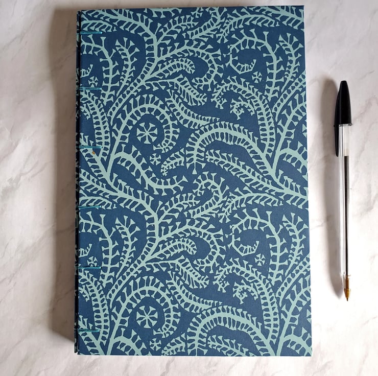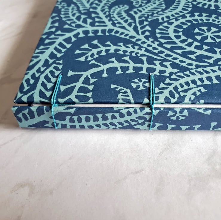 A large hand made hardcovered sketchbook or journal. The covers have a printed cyanotype-inspired design and it is filled with stiff cartridge paper for drawing, painting or writing.