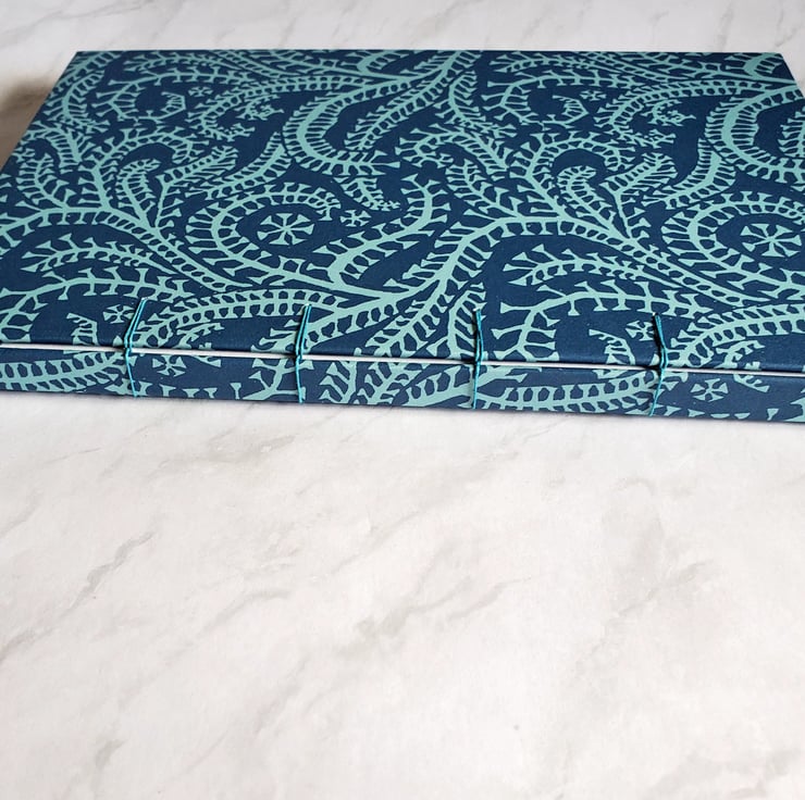 The book has a stiff spine, covered with matching patterned paper, with cover linings of soft aqua art paper.