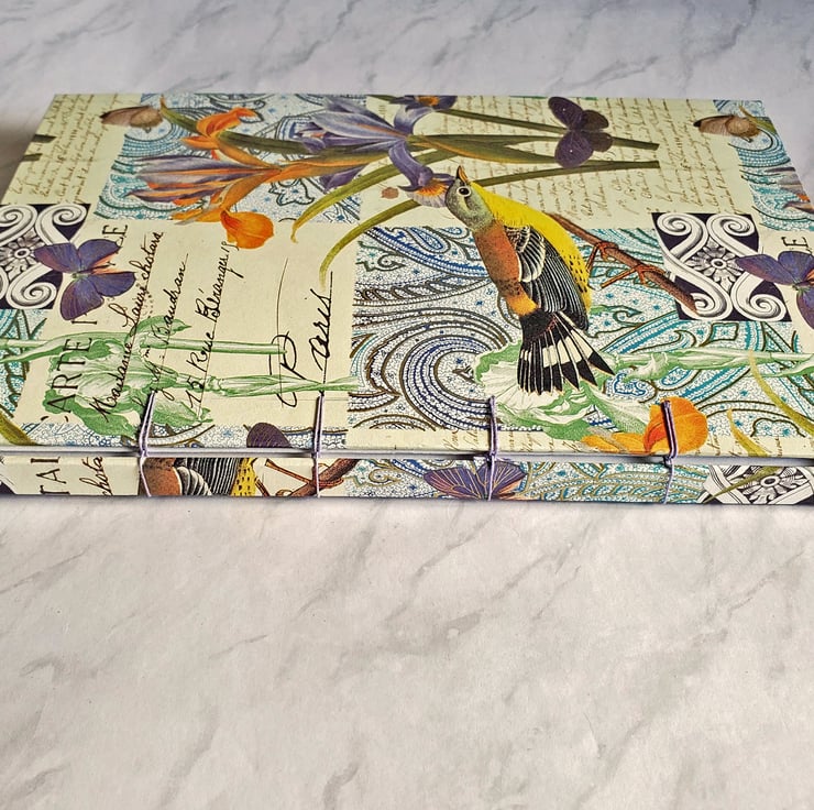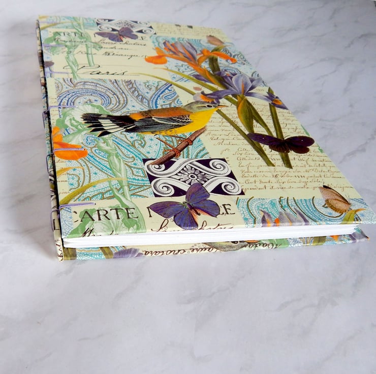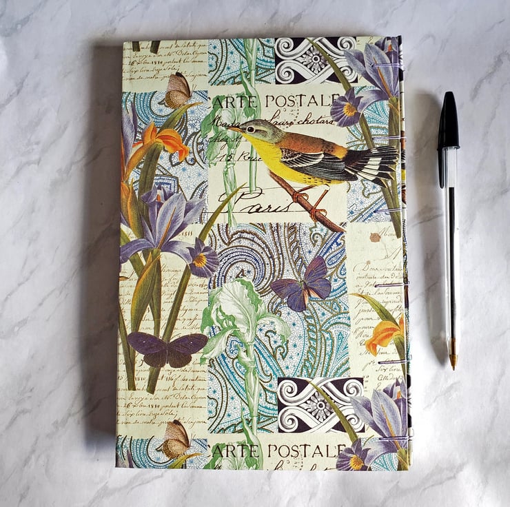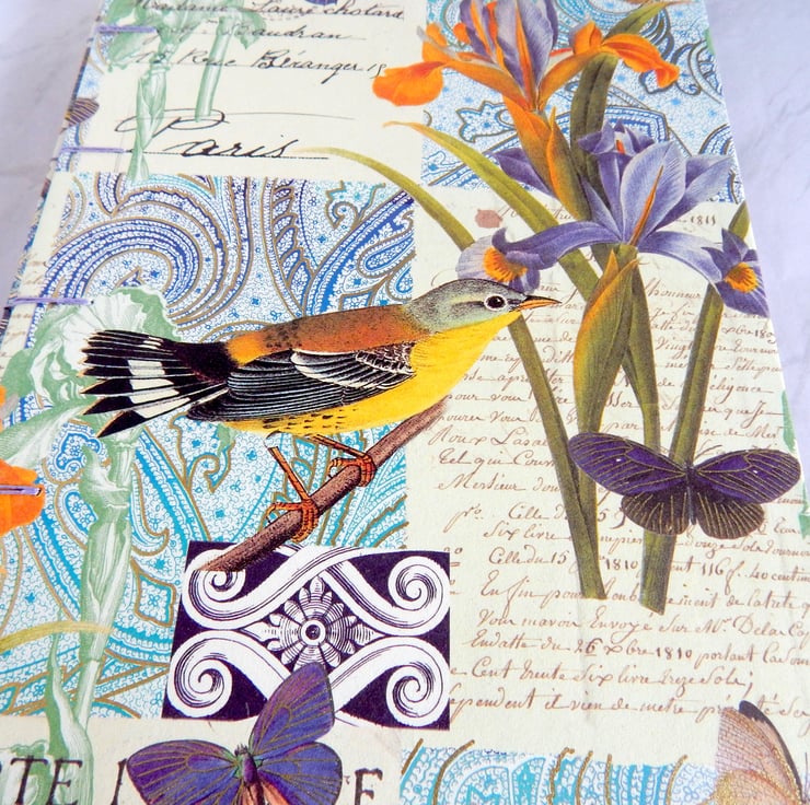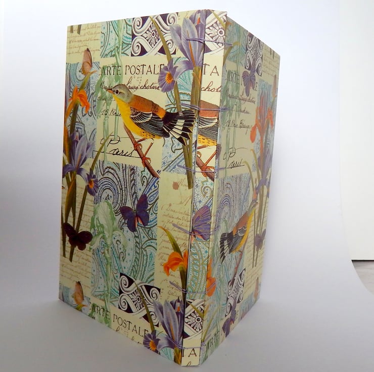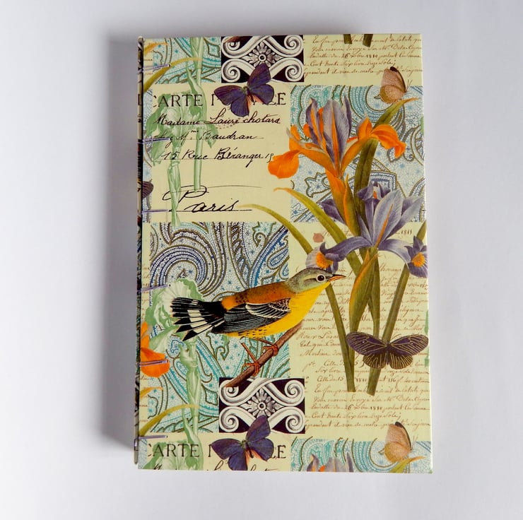 This book has covers of Italian paper, with a collaged design of birds, butterflies and iris flowers on a background of tiles and handwritten letters & envelopes.