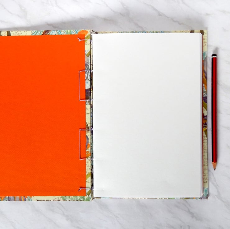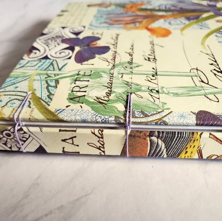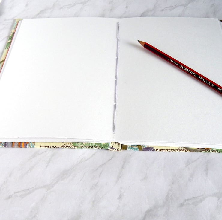 A larger-than-A5, hardcovered sketchbook or journal with covers of beautiful botanical design paper.