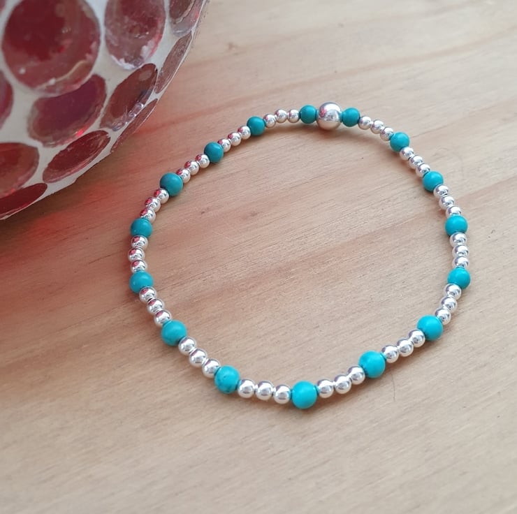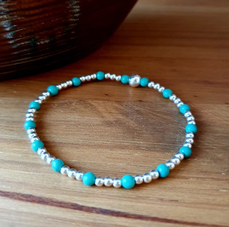 Sterling silver and turquoise bracelet featuring natural turquoise and sterling silver beads. The pattern here is 5 silver to 1 turquoise bead.