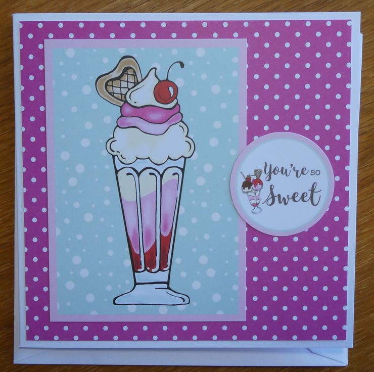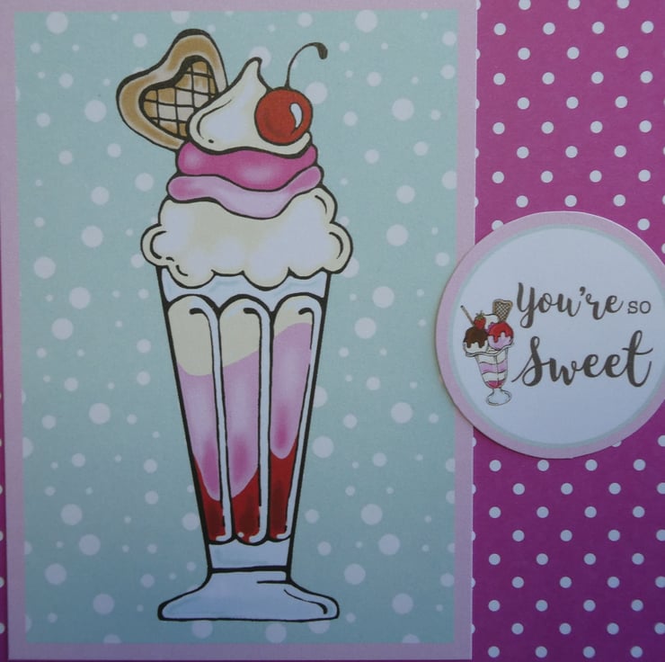 The card has a printed image of an ice cream sundae or knickerbocker glory with a cherry on top in pastel shades of pink, cream and green.
