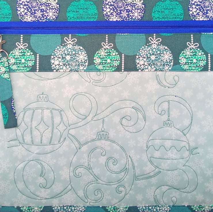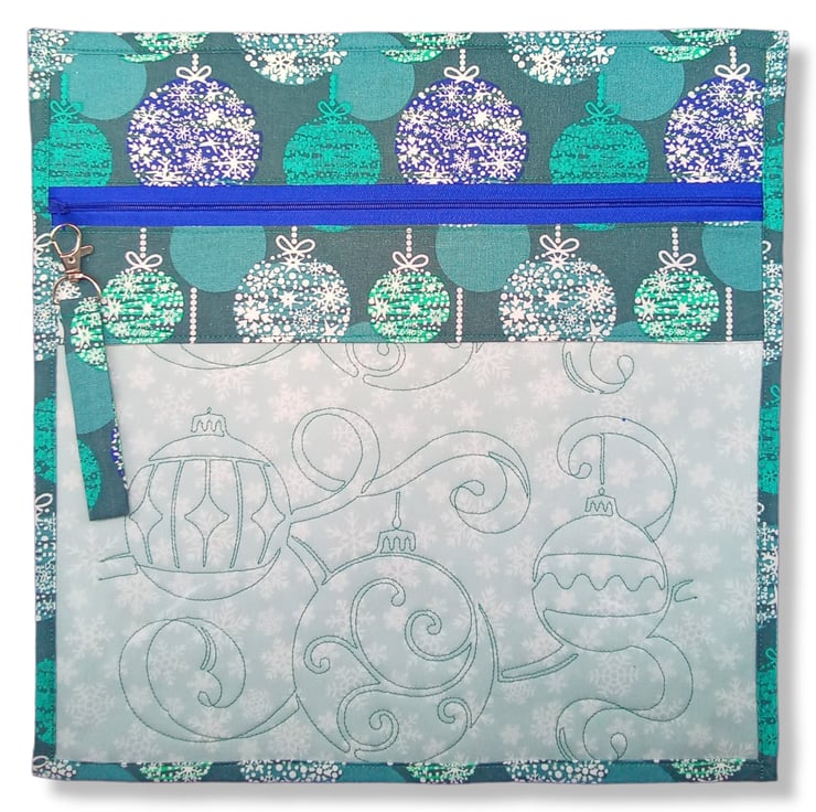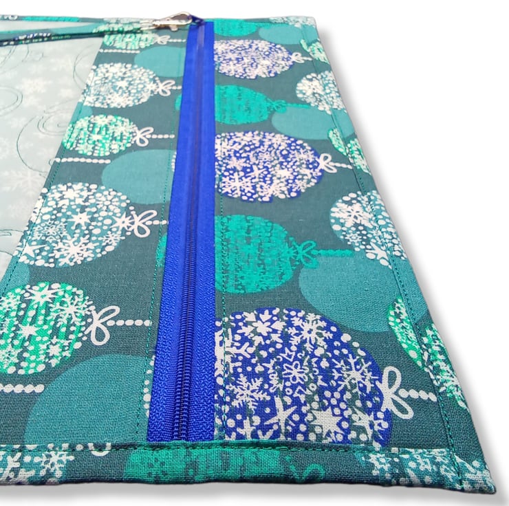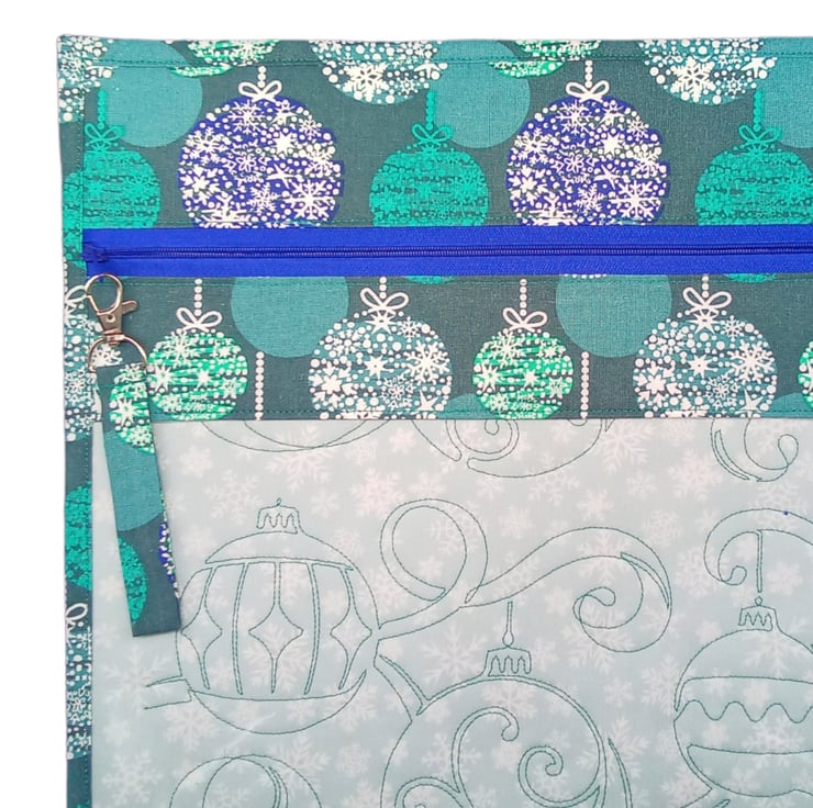 Made with 100% cotton in a Blue and Aqua Christmas Bauble design with pale grey snowflake interior which has machine embroidered with a Christmas Bauble design. It comes fully lined with no exposed seams with a nylon zipper and finished off with a removable zipper pull.