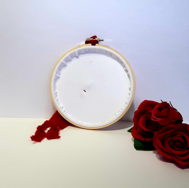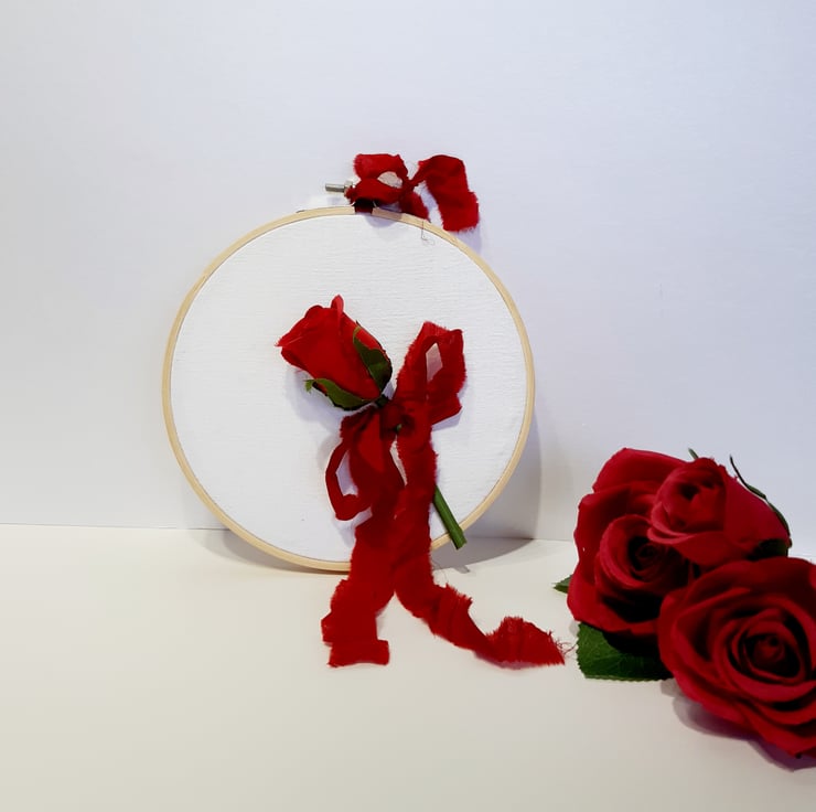 This single red rose bud has been attached to a 6" embroidery hoop that I've covered with recycled linen fabric. I attached the fabric single rose bud by stitching it into place and the rose bud stem has been covered using florist tape. Using recycled red sari fabric for both the bow and the hanging loop I think just finishes off the overall look. Makes a beautiful gift for all those who love red roses, those who love being in love and those who like unique embroidery hoops. Show your love.